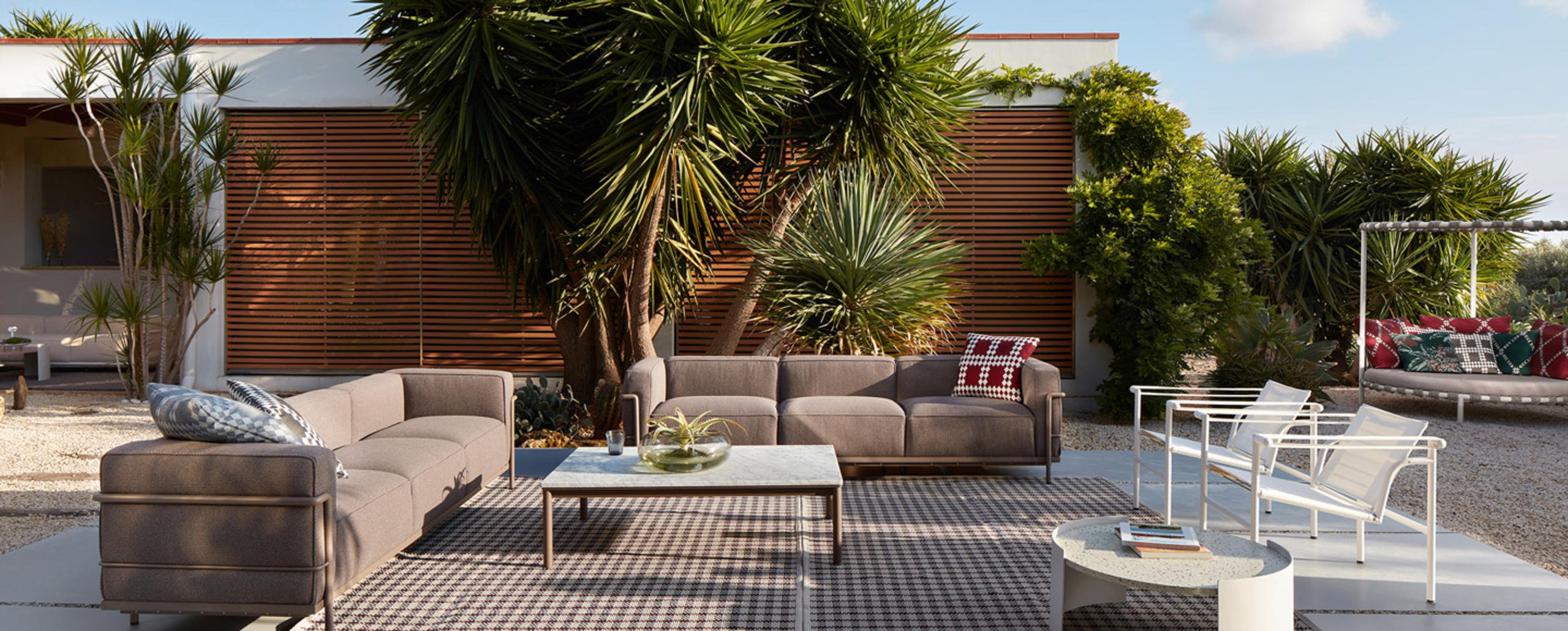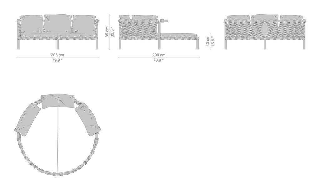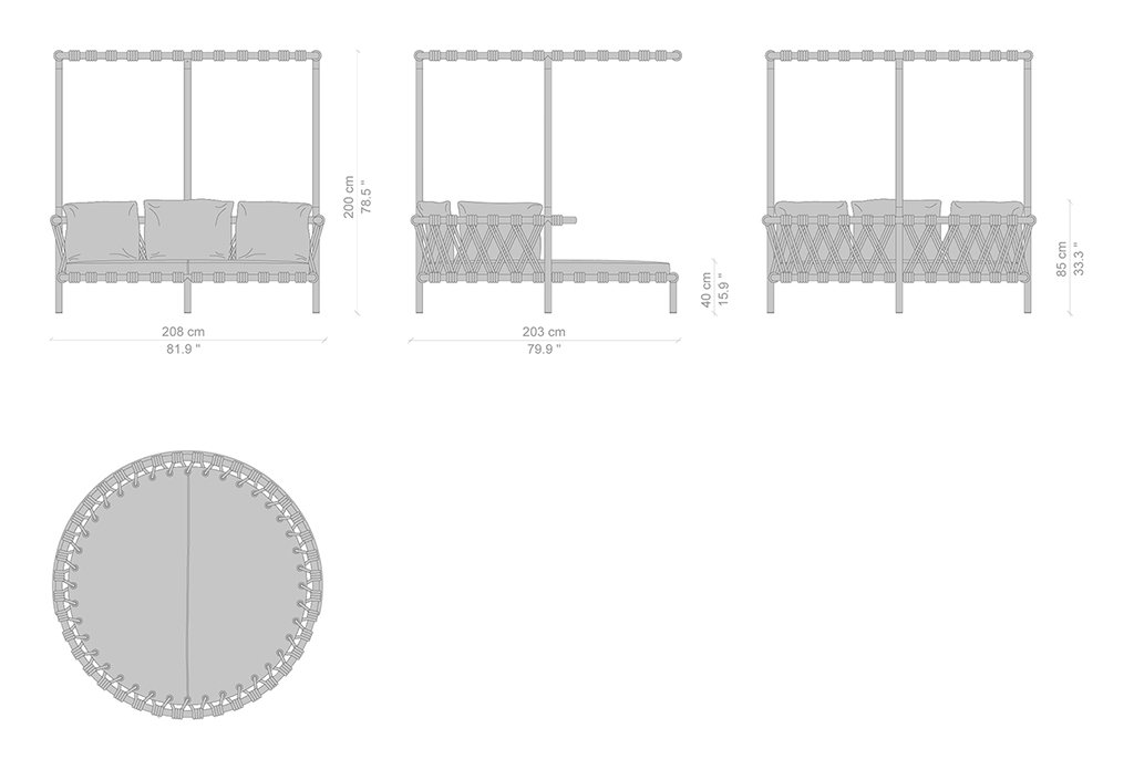 Patricia Urquiola interpreta la felicità della vita all’aria aperta con un prodotto di forte impatto, ispirato ai piccoli trampolini presenti nei giardini delle case in Groenlandia. Trampoline è un love bed con struttura in acciaio Inox AISI 304 verniciato, scenografico ed elegante, dalle forme morbide e giocose, perfetto per popolare accoglienti spazi open air; un’isola di relax e comfort grazie a un set di tre cuscini per lo schienale e a due tipologie di cuscini aggiuntivi, tutti in poliuretano espanso ricoperto con morbida ovatta di poliestere e rivestiti da tela idrorepellente. è disponibile sia in versione divano basso sia divano con baldacchino – per ripararsi dal sole –, entrambi caratterizzati dall’intreccio realizzato a mano in corda di polipropilene e nylon, in mélange o in multicolore, che avvolge la base e lo schienale, e che diventa decorazione distintiva.