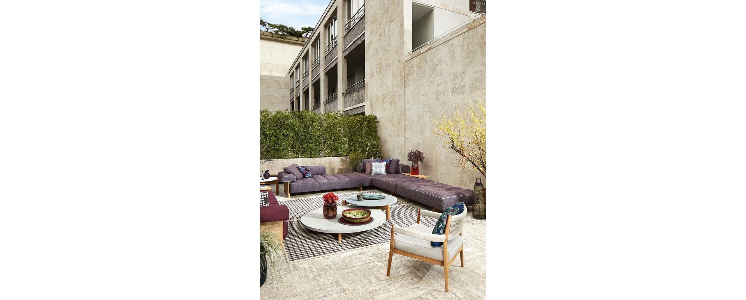Il tavolino basso della collezione Sail Out, disegnata da Rodolfo Dordoni, è disponibile con piano in terrazzo giallo-bianco o verde-bianco o in cemento ed è sorretto da piedini in massello di teak. Completa la famiglia un divano componibile in tre moduli e tre elementi e un pouf in due misure.