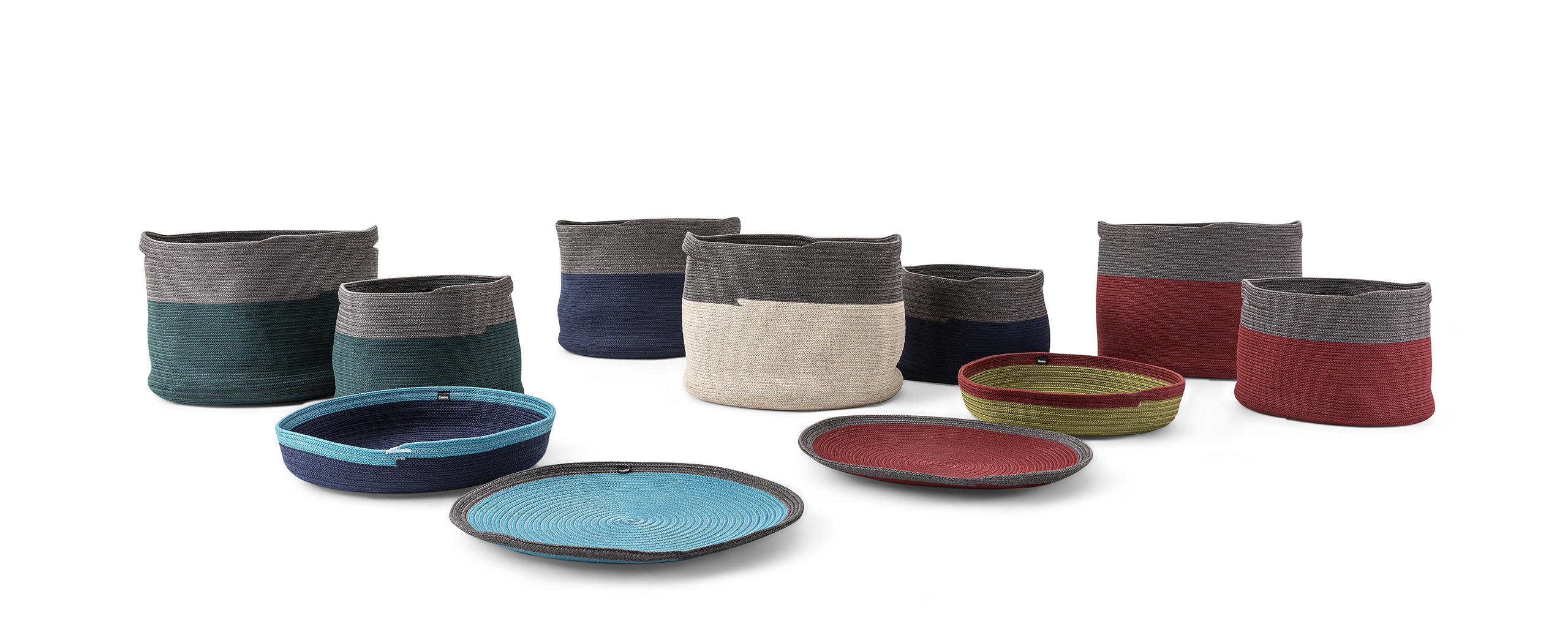 Ispirati alle forme e ai colori brillanti dei canestri realizzati in vimini dagli artigiani in Africa, sono realizzati utilizzando materiali e tecniche innovative. Il tecnologico filato di polipropilene, intrecciato e cucito a mano, garantisce stabilità dei colori ai raggi UV, versatilità e resistenza; inoltre è rispettoso della salute ed ecologico, perché a basso impatto ambientale e riciclabile al 100%.