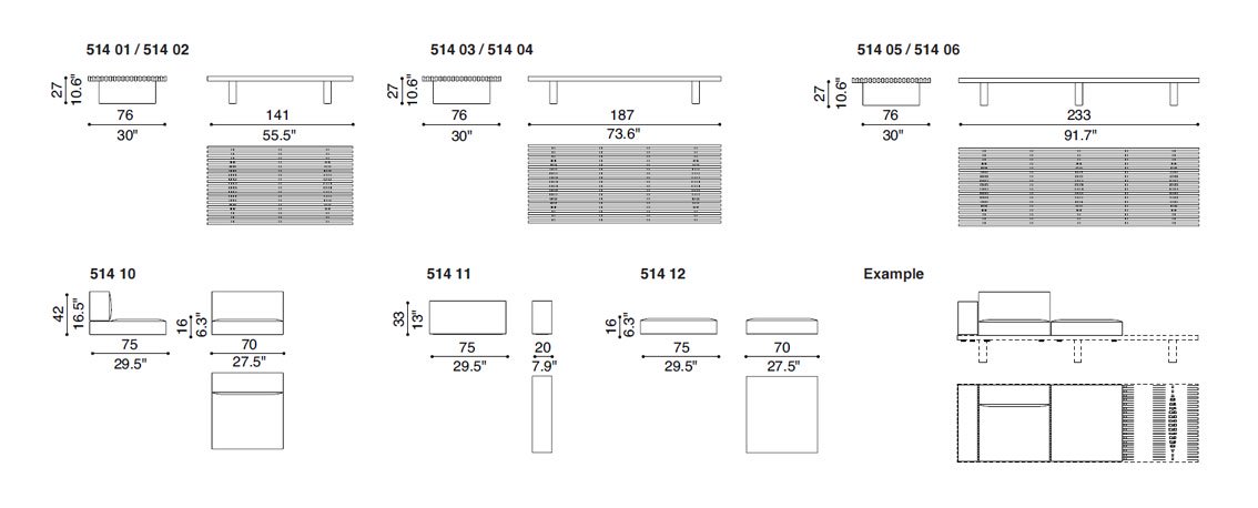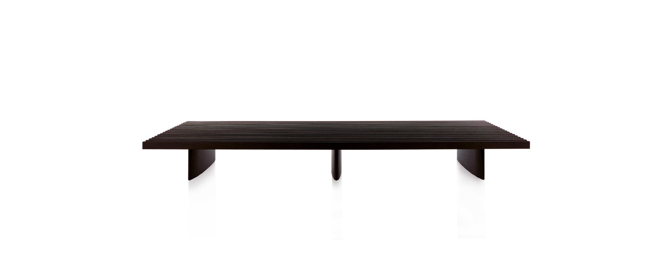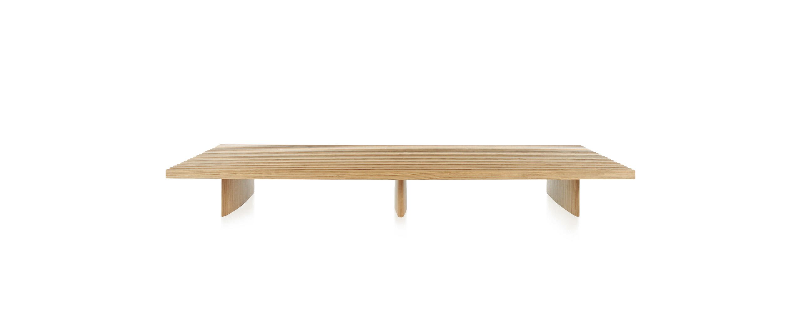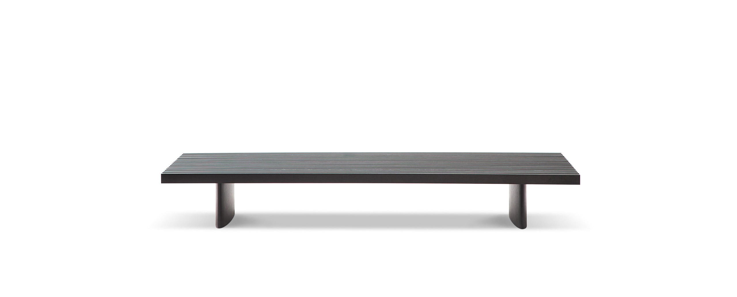 Un piano costituito da una grata di diciannove listelli disposti in parallelo, proposto nella finitura rovere naturale o tinto scuro, posto ad un’altezza contenuta per un uso polivalente: utilizzabile come tavolino, come panca o imbottito con la semplice aggiunta di cuscini (bracciolo, sedile e set di cuscini seduta e schienale), che vengono aggregati alla struttura e resi solidali con essa grazie ad un semplice sistema di fissaggio Charlotte Perriand ha creato questo sistema modulare nel 1953 a Tokyo, per suo uso personale.