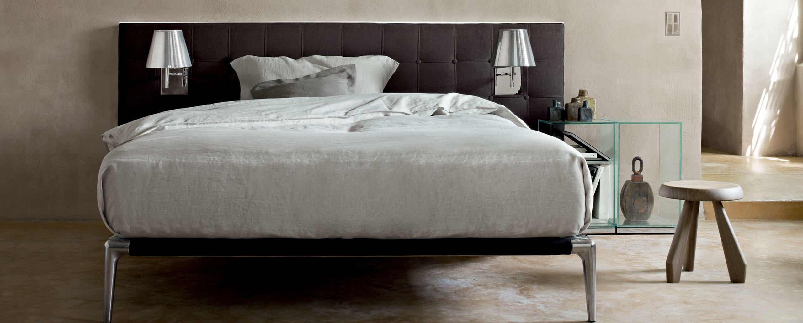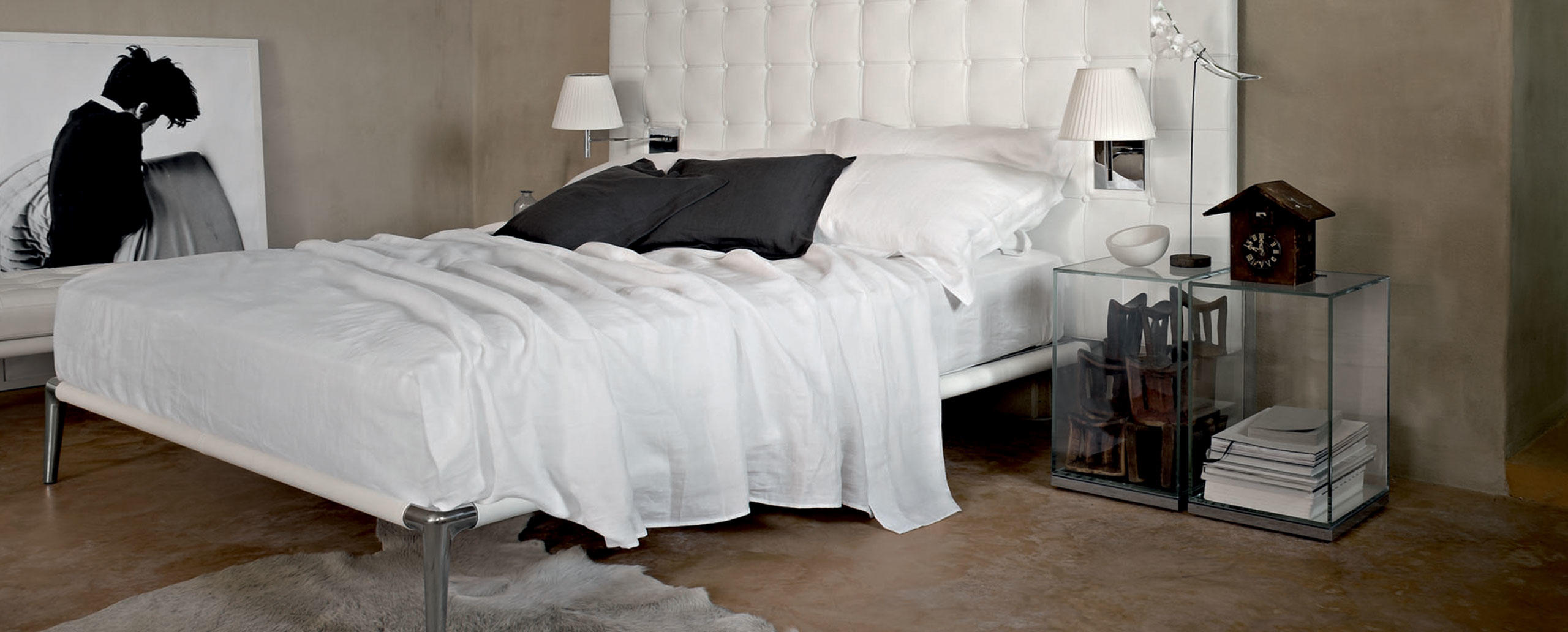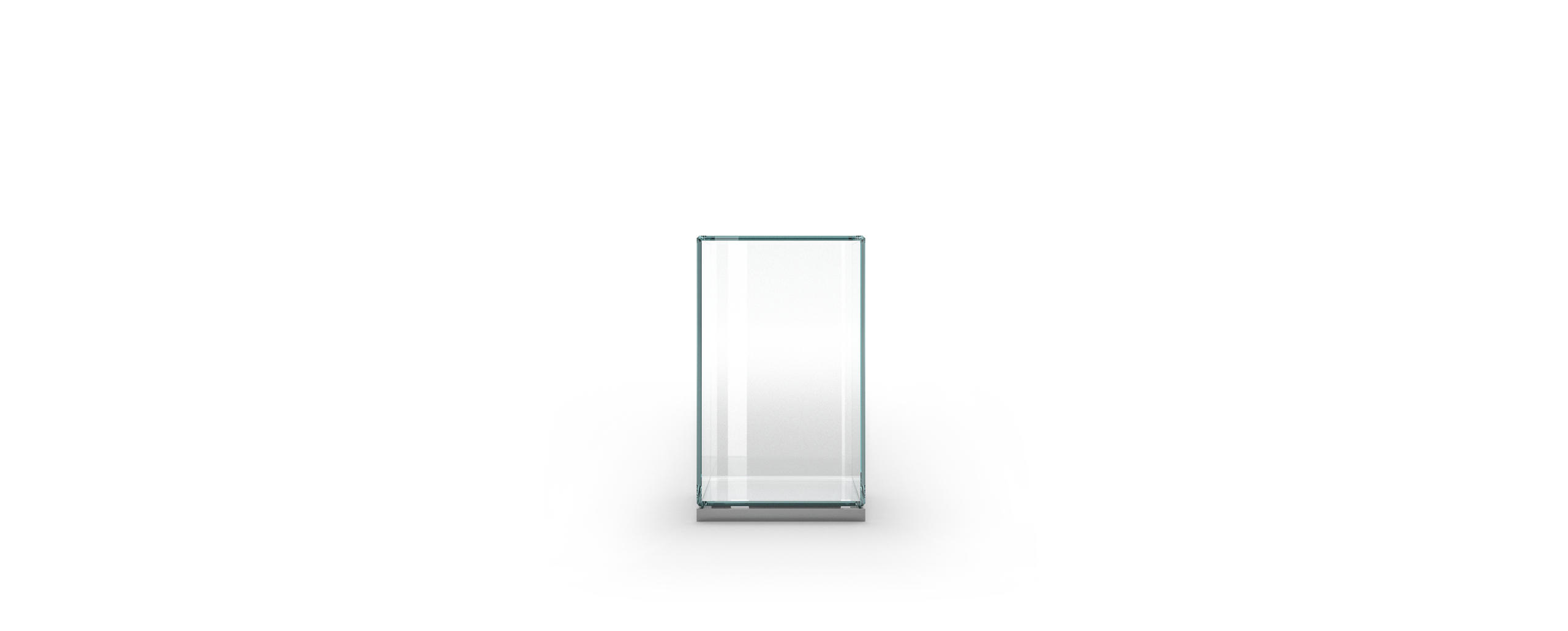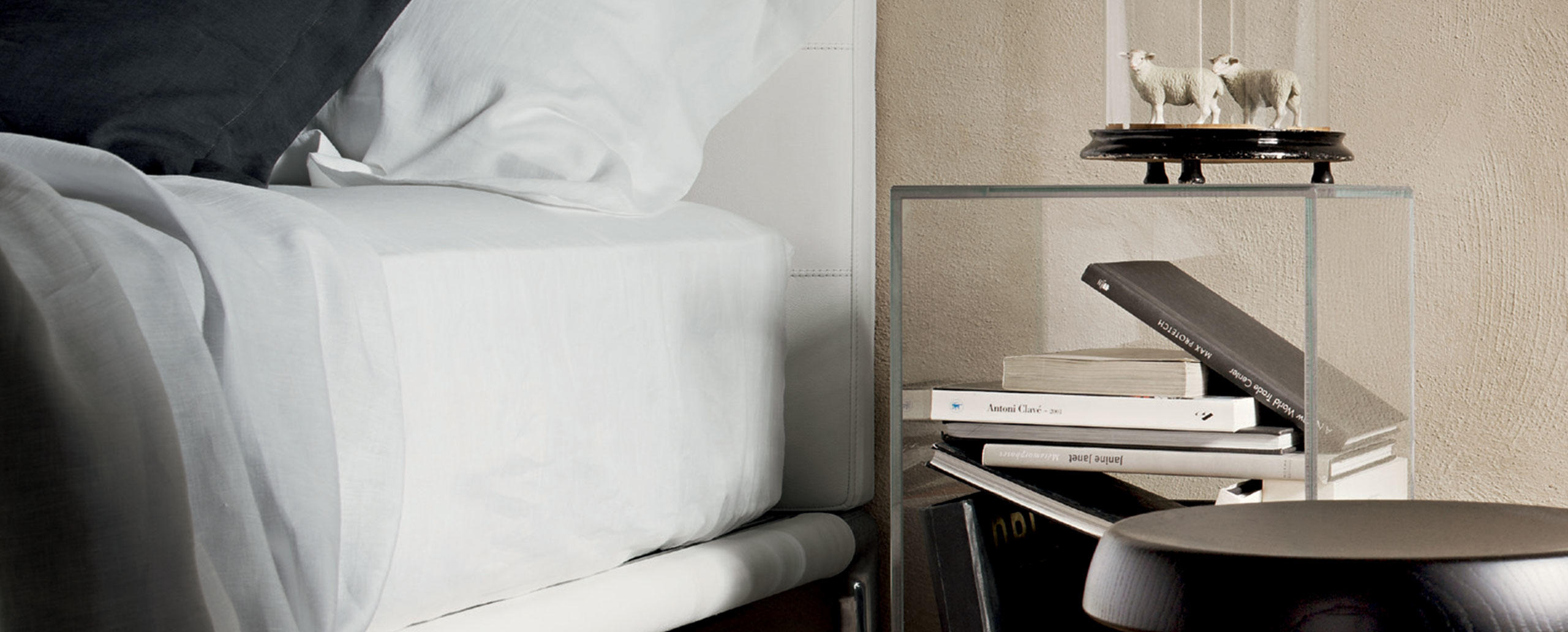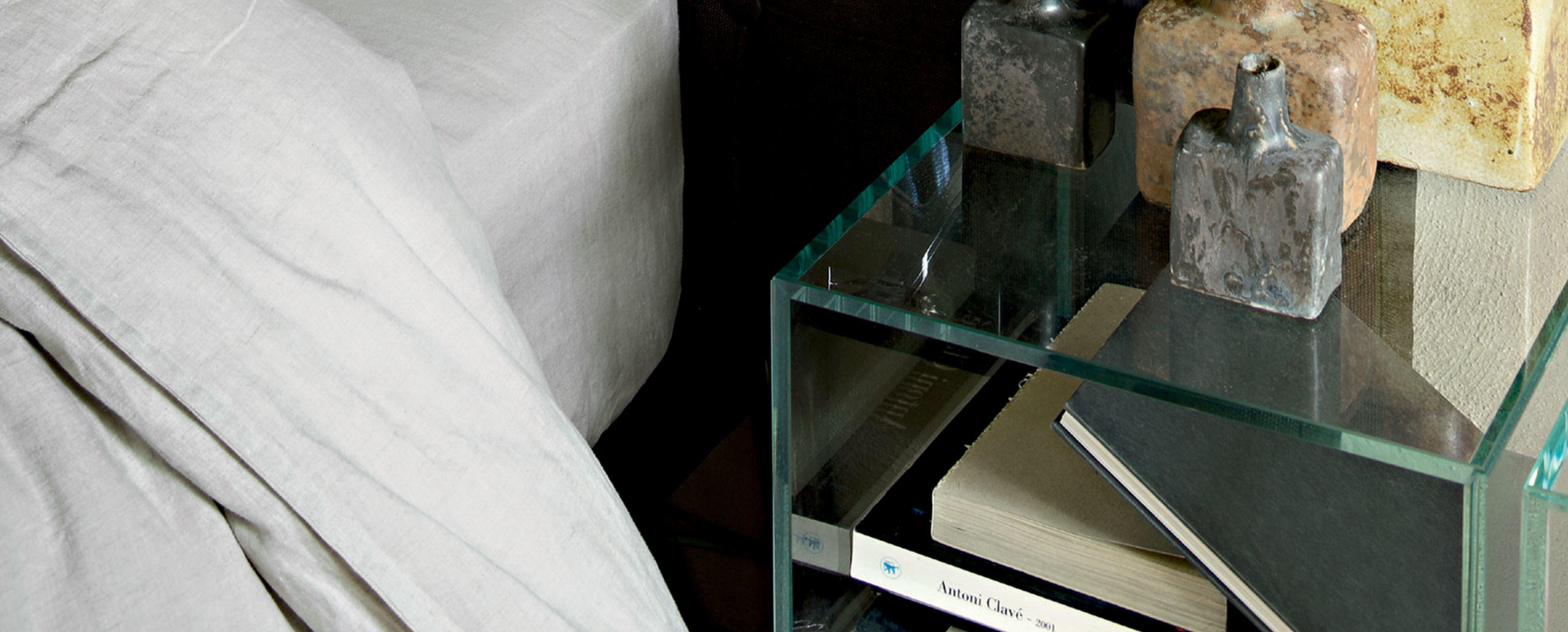 Da abbinare al letto disegnato da Philippe Starck, il comodino Volage è un parallelepi-pedo in vetro extrachiaro con base in acciaio cromato. Aperto sul fronte, può essere usa-to come bedside table o come contenitore. Completano la collezione il letto e una panca.