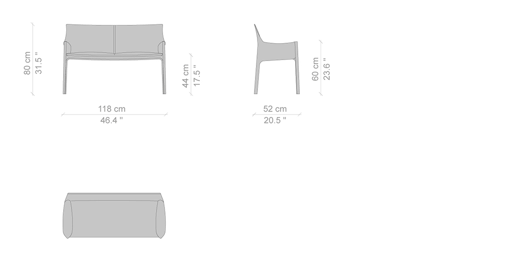 Poltrona e divanetto con struttura in acciaio verniciato. Schienale e cuscino sedile imbottiti in poliuretano espanso privo di CFC. Rivestimento in cuoio, calzato sulla struttura e chiuso con cerniere, in differenti colori.