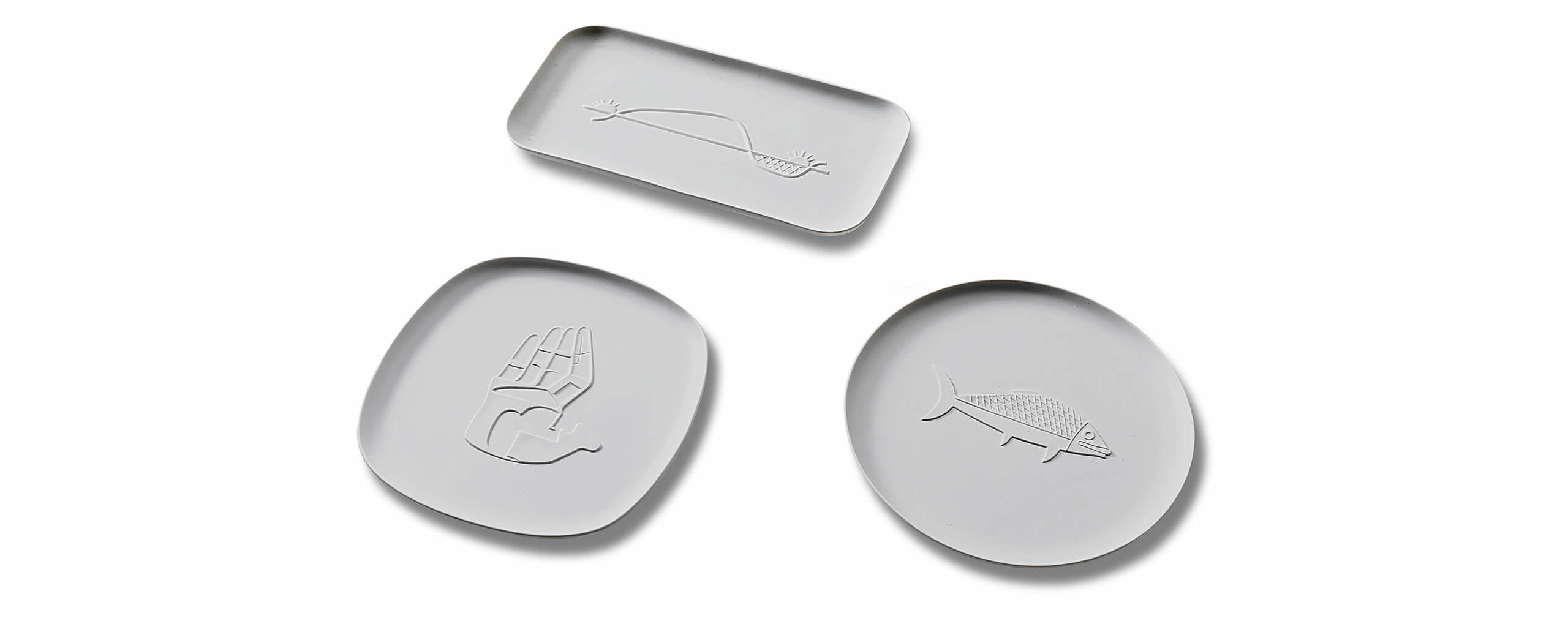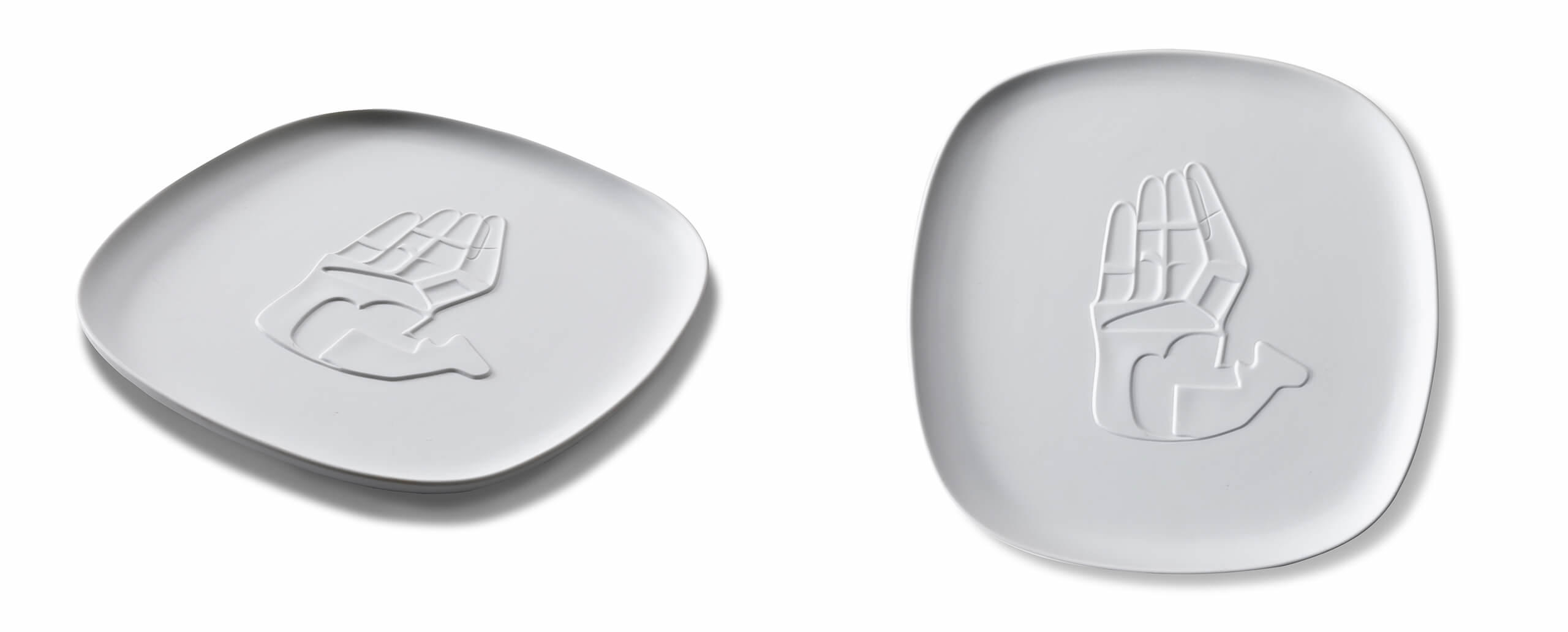 Cassina si ispira al genio di Le Corbusier per una collezione di tre vassoi in porcellana pura non smaltata, che riprendono alcuni simboli in bassorilievo scelti per i muri degli edifici di Chandigarh, la città progettata negli anni ’50, oggi iscritta nella lista del Patrimonio mondiale dell’umanità. Lo stesso procedimento si ritrova a Marsiglia nell’Unité d’Habitation con le sculptures moulées, disegni simbolici fatti imprimere da Le Corbusier nel cemento – béton brut – tratti dal suo repertorio figurativo. Ciascun vassoio, realizzato da Richard Ginori, riporta un soggetto tracciato dal Maestro nel 1956: la mano aperta che rievoca alla pace (vassoio quadrato con gli angoli smussati), il pesce (vassoio tondo), il movimento del sole (vassoio rettangolare).