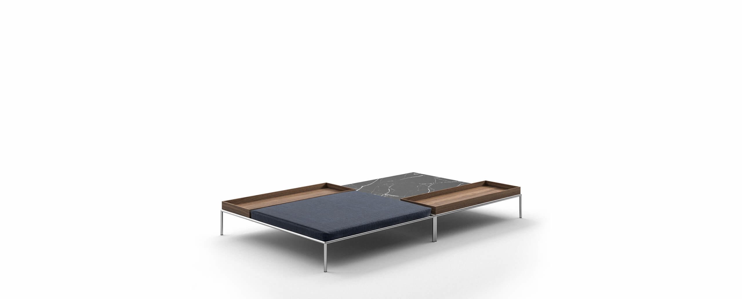 Il pouf/tavolino che completa il sistema Mex-Hi è un elemento versatile, adatto a molteplici spazi e configurazioni grazie alla sua modularità. Può combinare una seduta sottile con un piano in marmo o in legno, oppure un piano in marmo o in legno con un vassoio in legno massello o, ancora, essere un funzionale tavolino con piano in marmo o in legno massello. La struttura è in tubolare di acciaio.