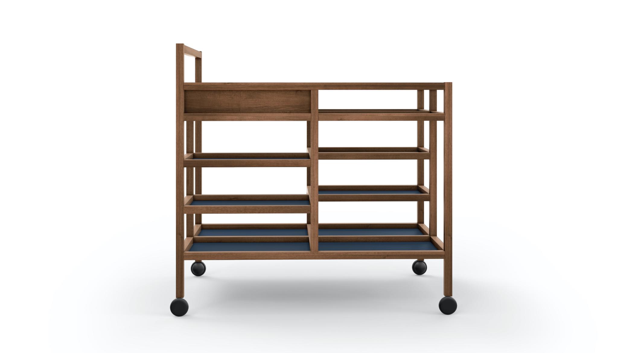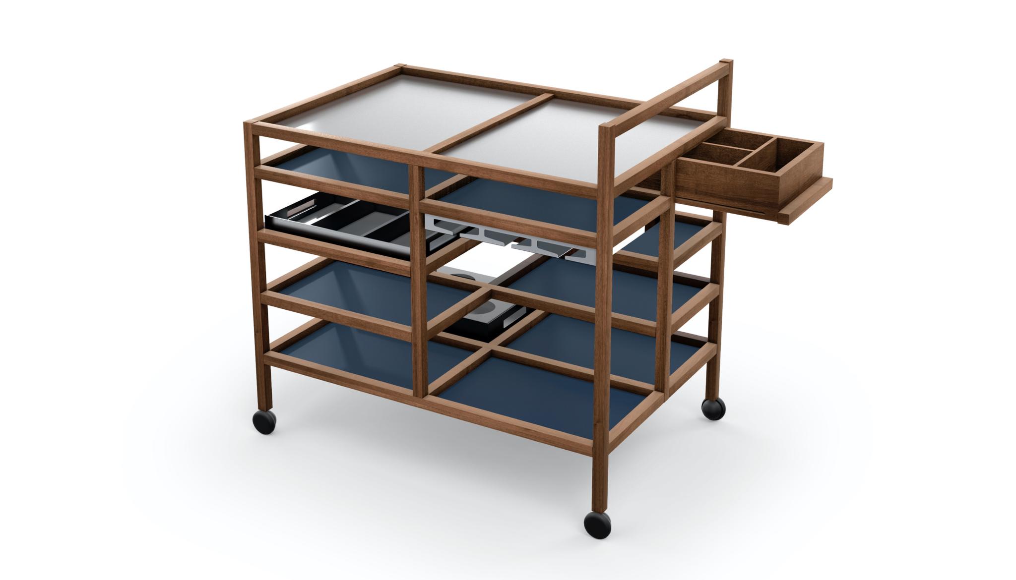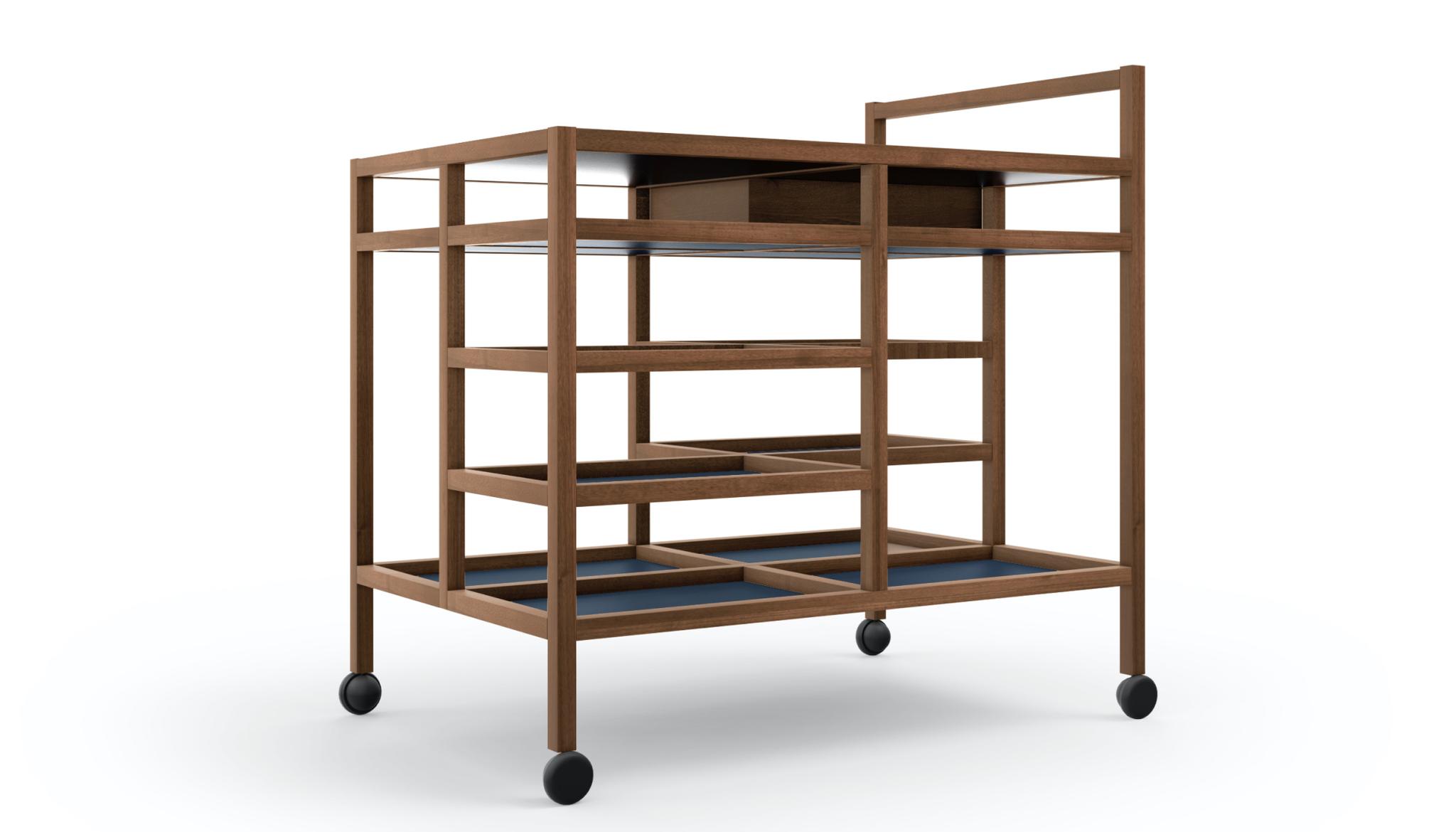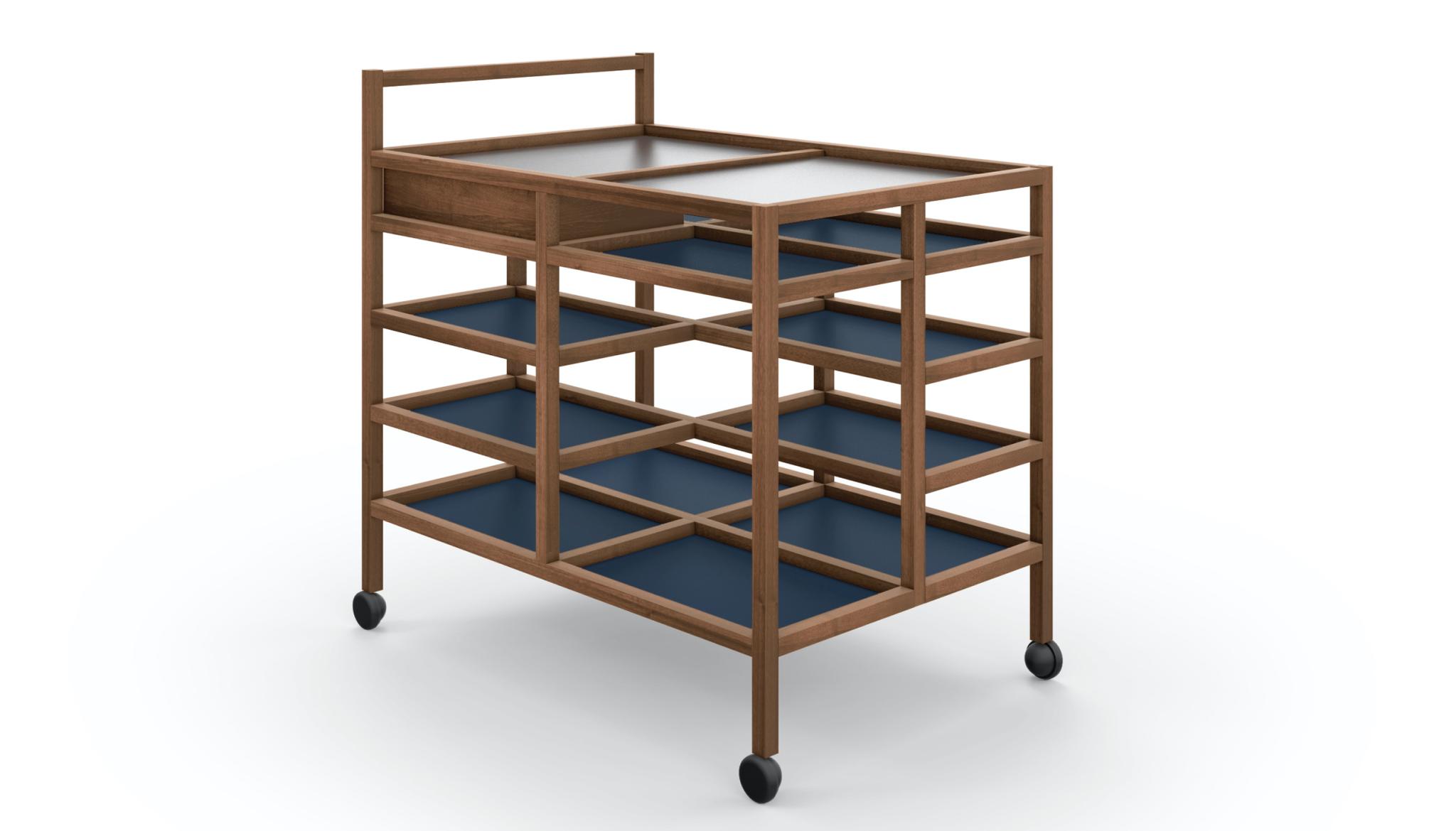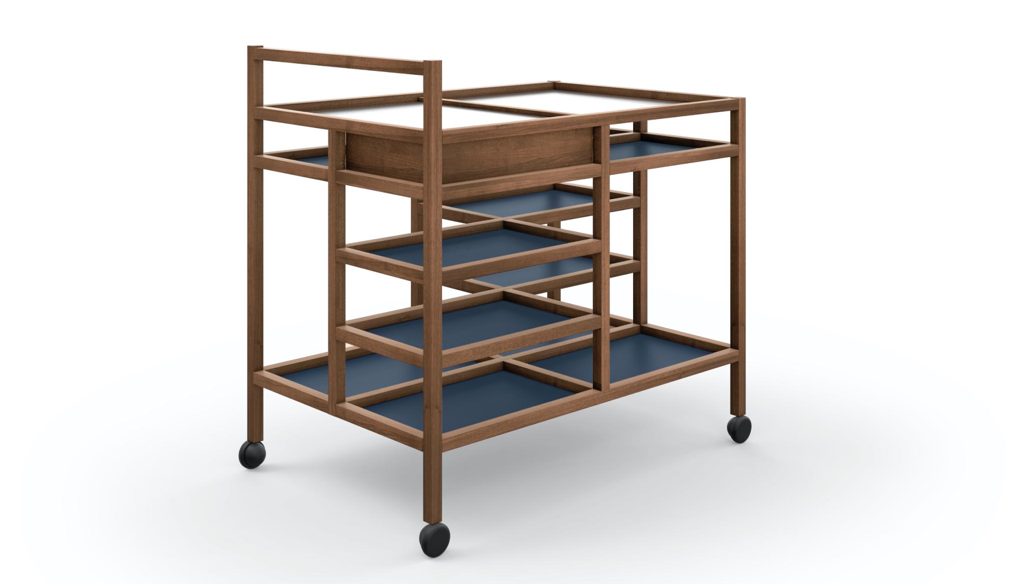 A serving cart, designed by Bodil Kj?r for the modern living room, where welcoming cheer is encouraged by versatile furniture that elegantly enhances new domestic lifestyles and a quest for comfort.