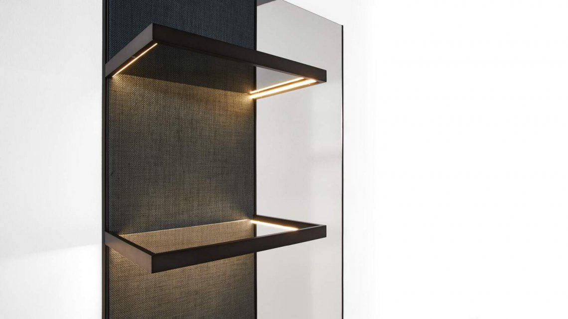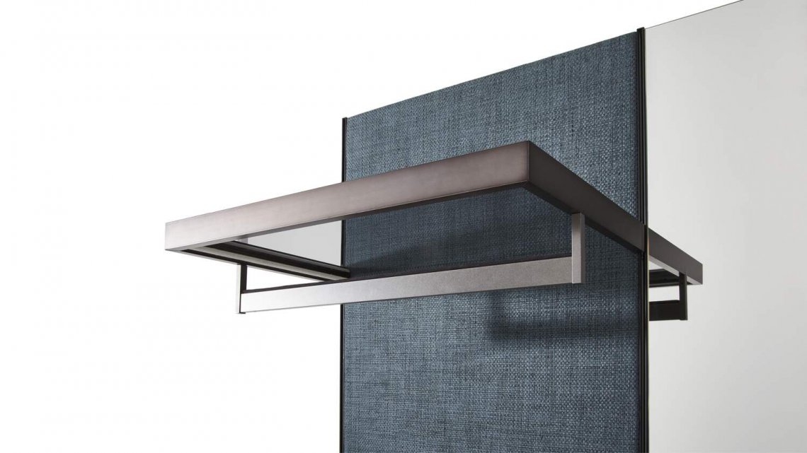 創新特點在于減少了約30mm的面板和支架厚度,從而可以偽裝結構并使墻壁像畫布一樣震撼。框架和支撐采用電氣化擠壓成型鋁齒軌,面板有不同的處理,如木質漆面或鑲貼木、鏡面玻璃或背漆玻璃、布藝,以及為臨時裝飾或墻紙準備的版本。此外,還配有一系列的附件,如帶有珍貴玻璃的不同深度的面板,可以使用LED燈照明,擱板上有一個配備了微纖密封圈的掛衣軌道,可以牢固而安靜地放置衣架,并且還有一面鏡子。