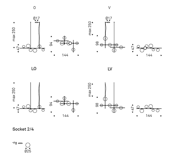 These come in different sizes, designed to balance the weight and volume composition of this branched designer light fitting. An even more stately effect is achieved by placing several chandeliers side by side to achieve a repeating modular effect.