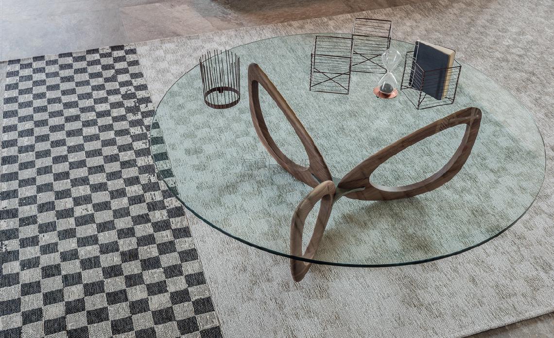 Coffee table with solid Canaletto walnut (NC) and transparent varnished steel (OP0) base. Clear glass top.
