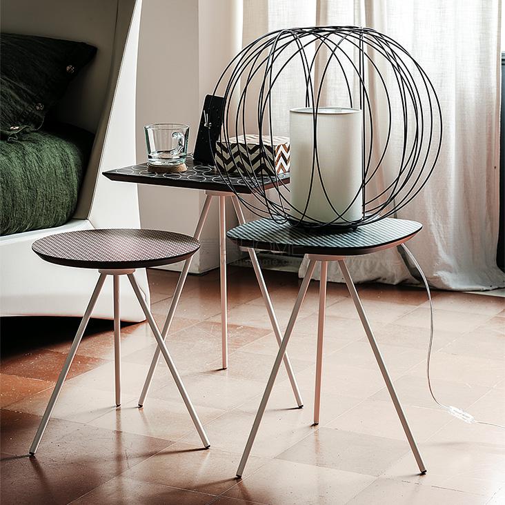 Coffee table with graphite (GFM69) or white (GFM71) embossed steel base. Top in printed maple with geometric pattern.