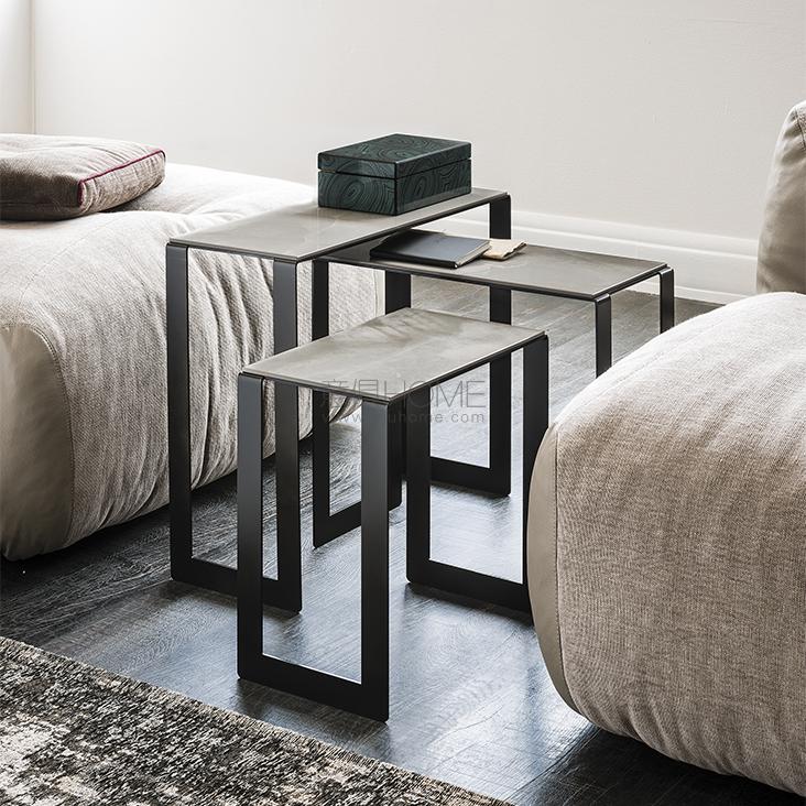 Coffee table with base in matt white (OP71), black (OP17) or graphite (OP69) painted steel. Marmi Calacatta (KM01), Alabastro (KM02), Ardesia (KM04), matt Portoro (KM07), glossy Portoro (KM08), Emperador (KM10), Makalu (KM11) or Arenal (KM13) ceramic top.