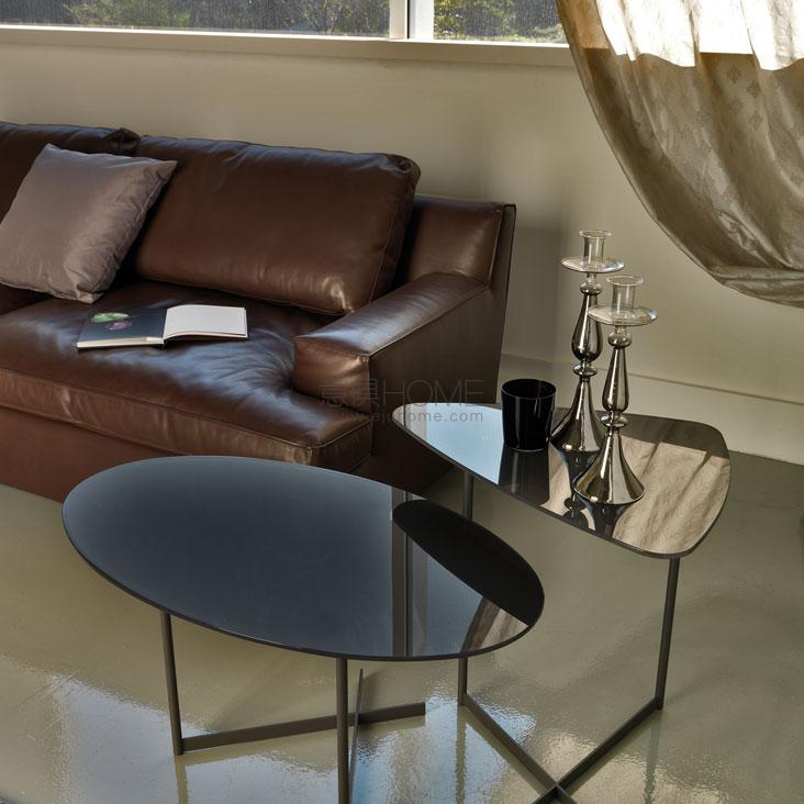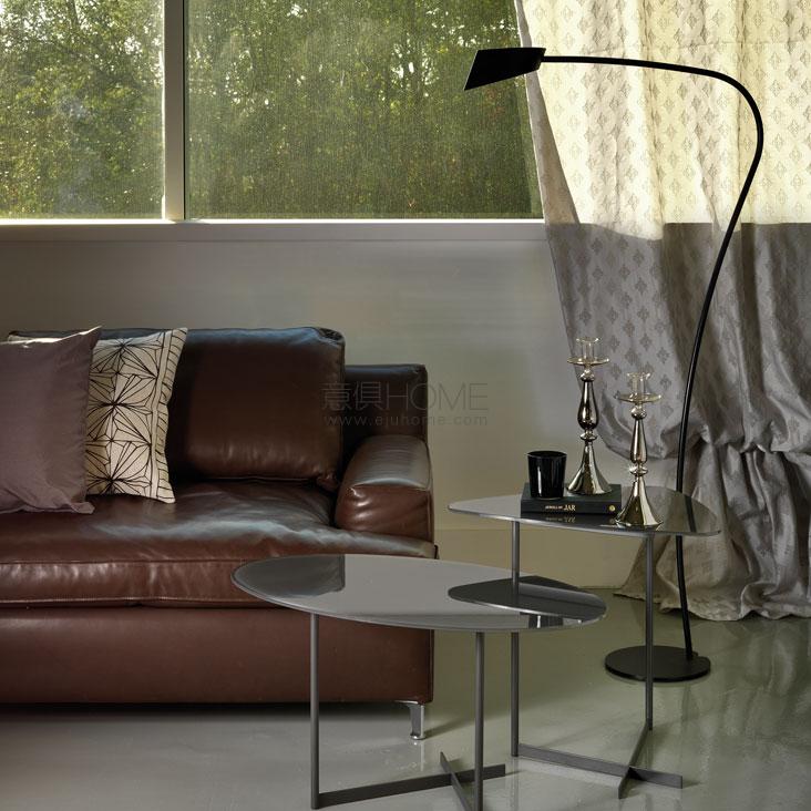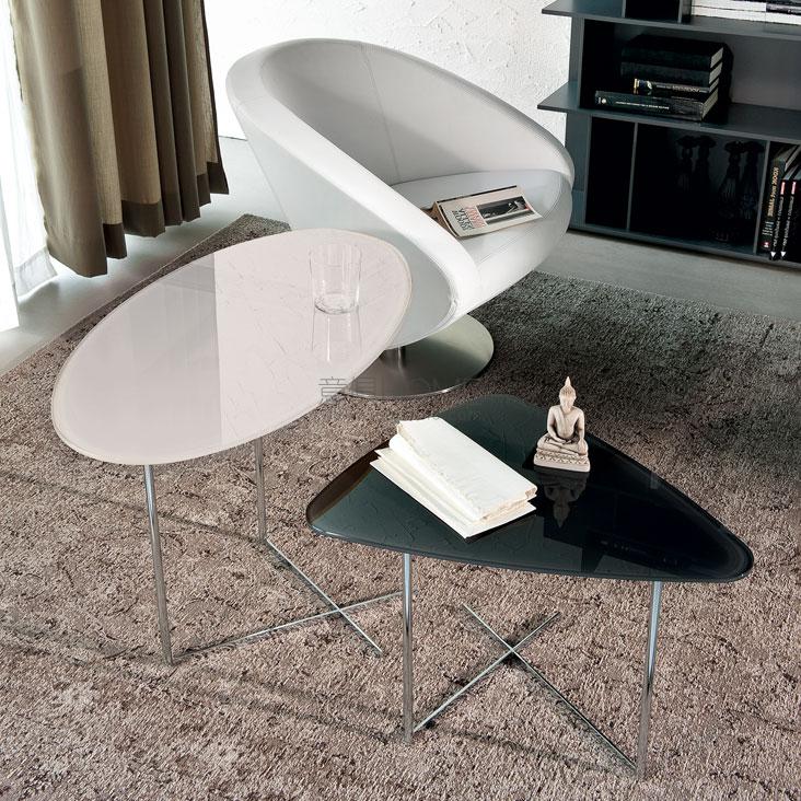 Coffee table with chromed (08) steel base, matt graphite (OP69) or white (OP71) painted steel. Top in 8mm extra clear white, graphite, oyster, yellow or green painted tempered glass.
