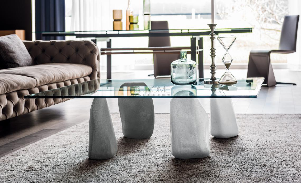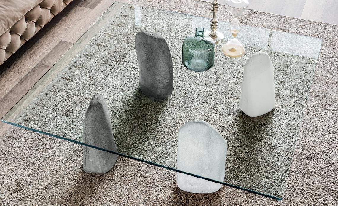 Coffe table with base in white or grey colored cement. Top in clear glass.