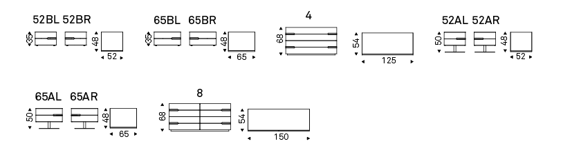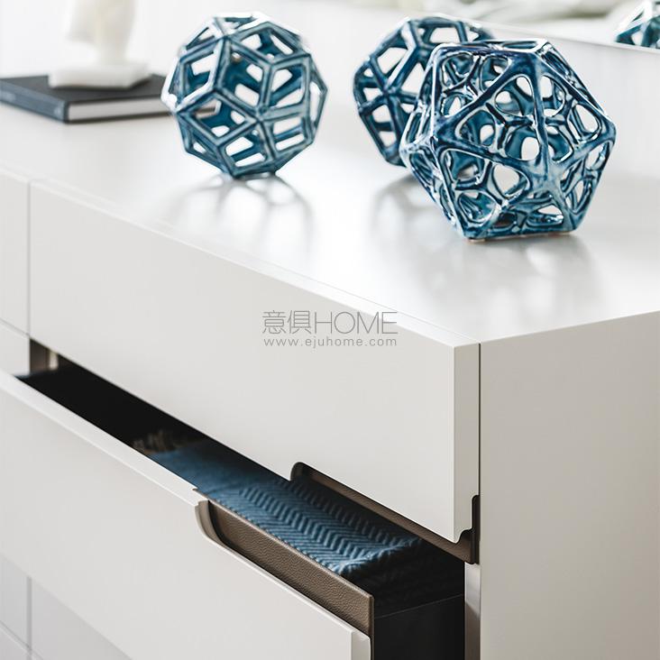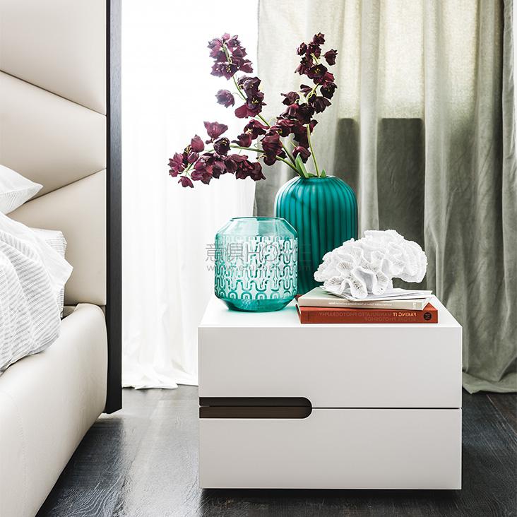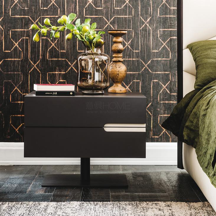 Nightstand in two sizes and two heights with 2 drawers, dresser with 4/8 drawers with frame and fronts in oyster (GF50) or graphite (GF69) embossed lacquered wood, or Canaletto walnut (NC) or burnt oak (RB). Inserts in synthetic leather or soft leather as per our sample cards. A Version with graphite (GFM69) embossed lacquered steel base.