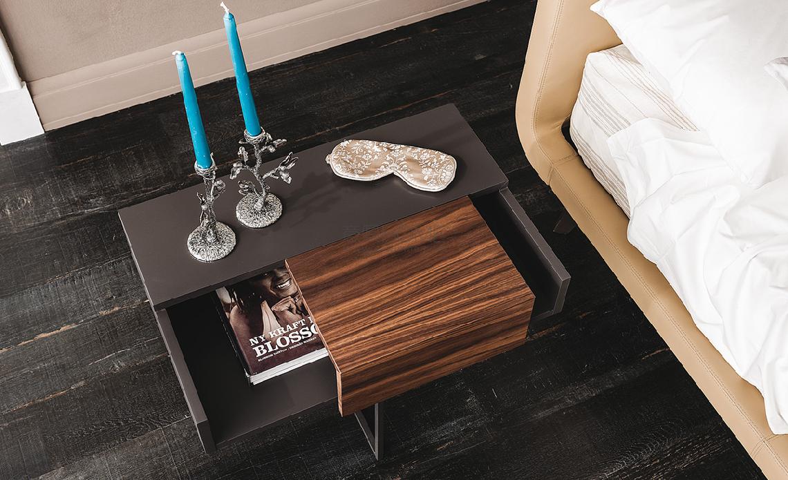 Nightstand in graphite (GF69) or white (GF71) embossed lacquered wood with sliding door in Canaletto walnut (NC) or burned oak (RB). Base in white (GFM71) or graphite (GFM69) embossed lacquered steel.