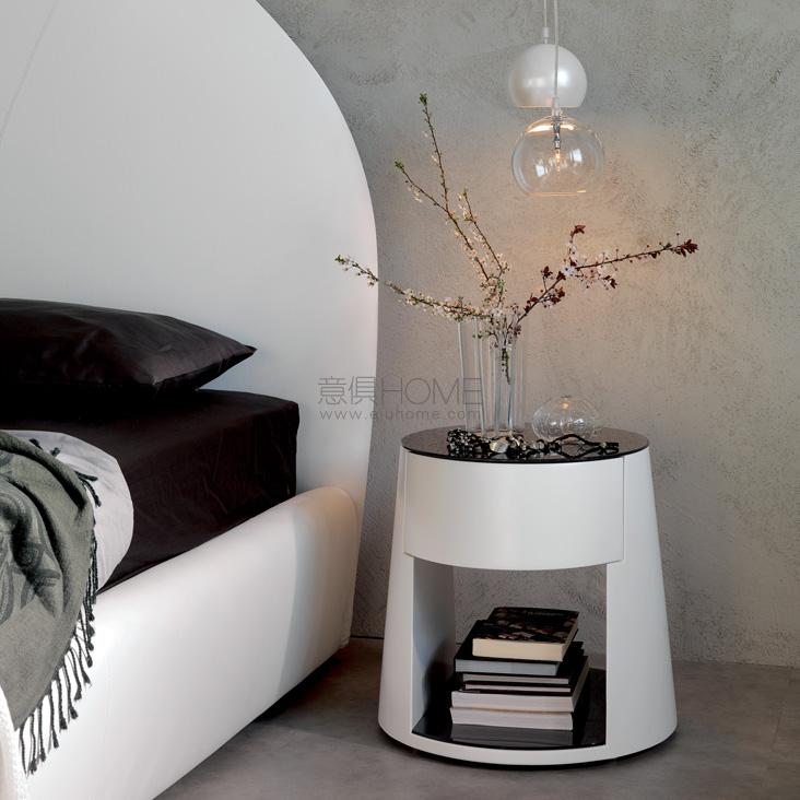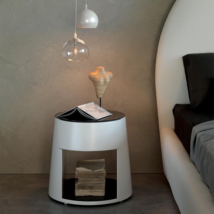 Nightstand with drawer in white (OP71) painted rigid polyurethane. Shelves in 5mm tempered extra clear white or graphite painted glass.