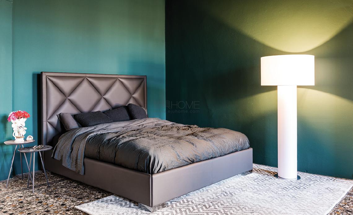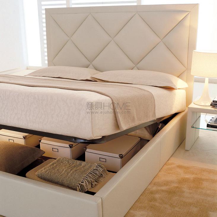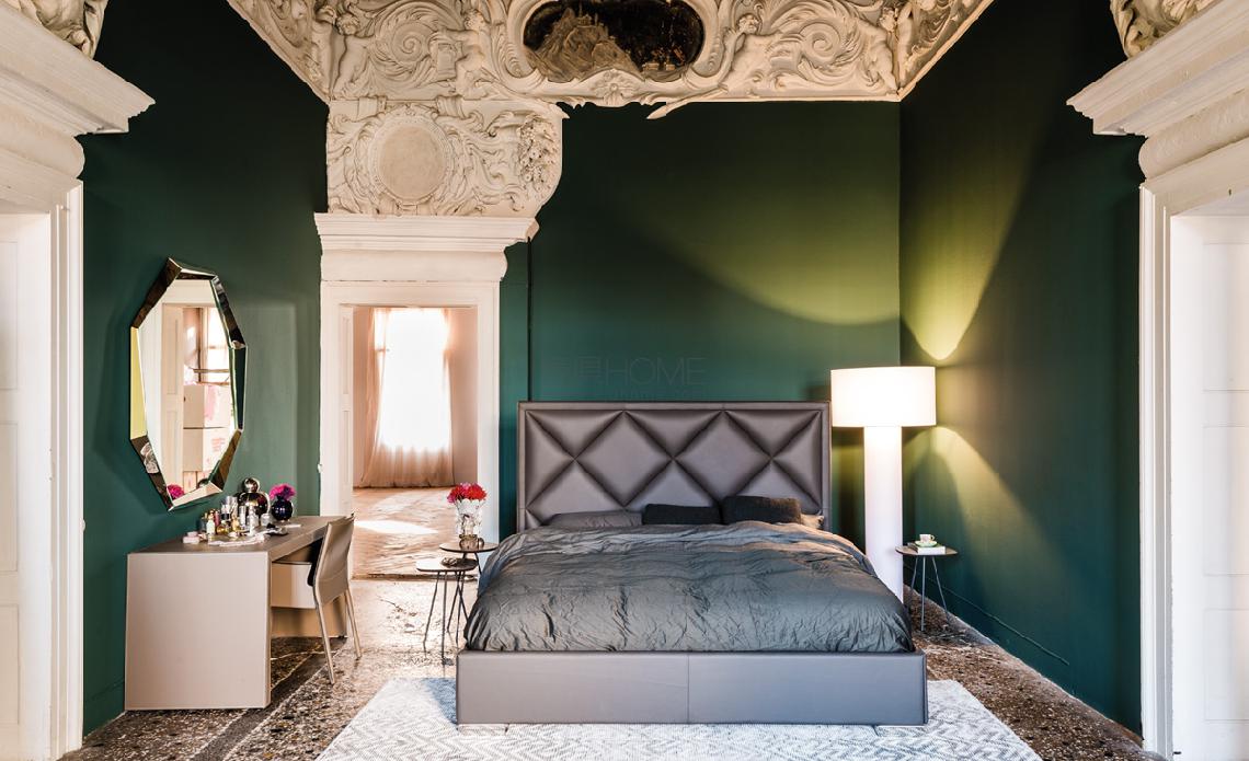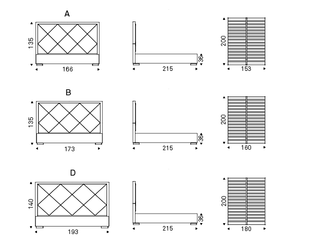 Upholstered bed covered in fabric, synthetic nubuck, micro nubuck, synthetic leather or soft leather as per sample card. Polished stainless steel feet. Slats included. Optional: pull-up slats with container.