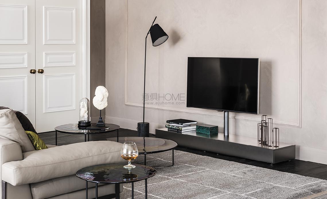 TV stand with 15° adjustable support, embossed white (GF71) or black (GF73) painted base and flap door. TV Max capacity: 40 kg. Pre-arranged for Vesa fitting 75, 100, 200, 300 and 400.