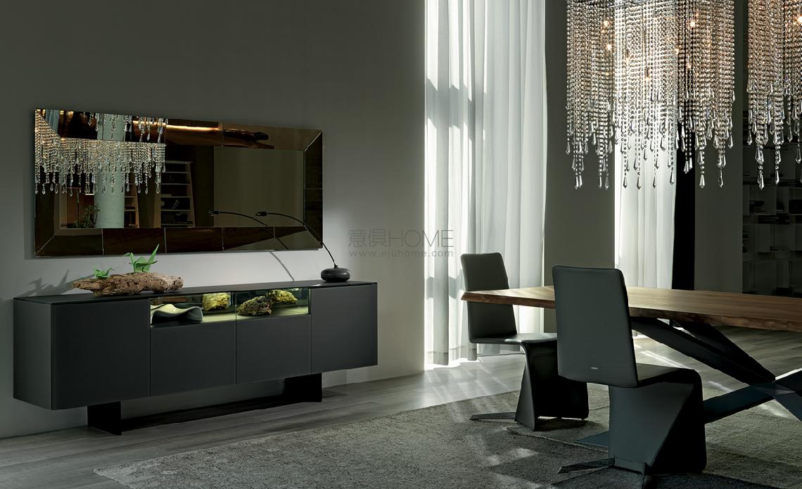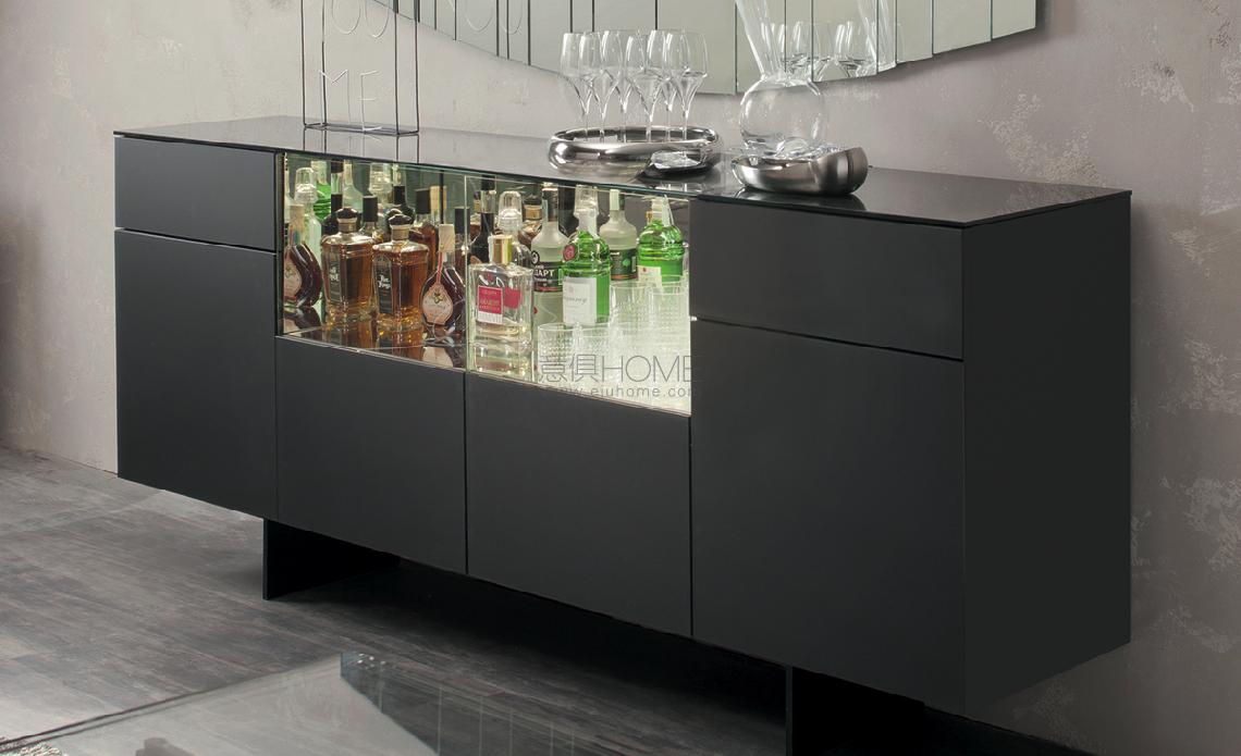 Sideboard with wooden frame covered in frosted extra clear glass painted graphite. Central doors covered in clear and painted glass. Central section covered with mirrored glass and with lights. Graphite (GFM69) embossed lacquered steel feet.