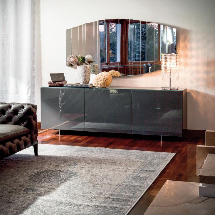 Sideboard in white (OP7), grey (OP30), graphite (OP69), oyster (OP50) or black (OP17) matt lacquered wood. Doors with satin aluminium frame and black or extra clear white, grey, graphite, oyster varnished glass or extra clear frosted glass white or graphite varnished. Top in black or extra clear white, grey, graphite, oyster varnished glass or extra clear frosted glass white or graphite varnished. Clear glass shelves. Optional: internal drawer in each door. In the 4 version, optional internal drawer only in the two lower doors. Polished stainless steel feet or matt white (OP71), black (OP17) or graphite (OP69) varnished.