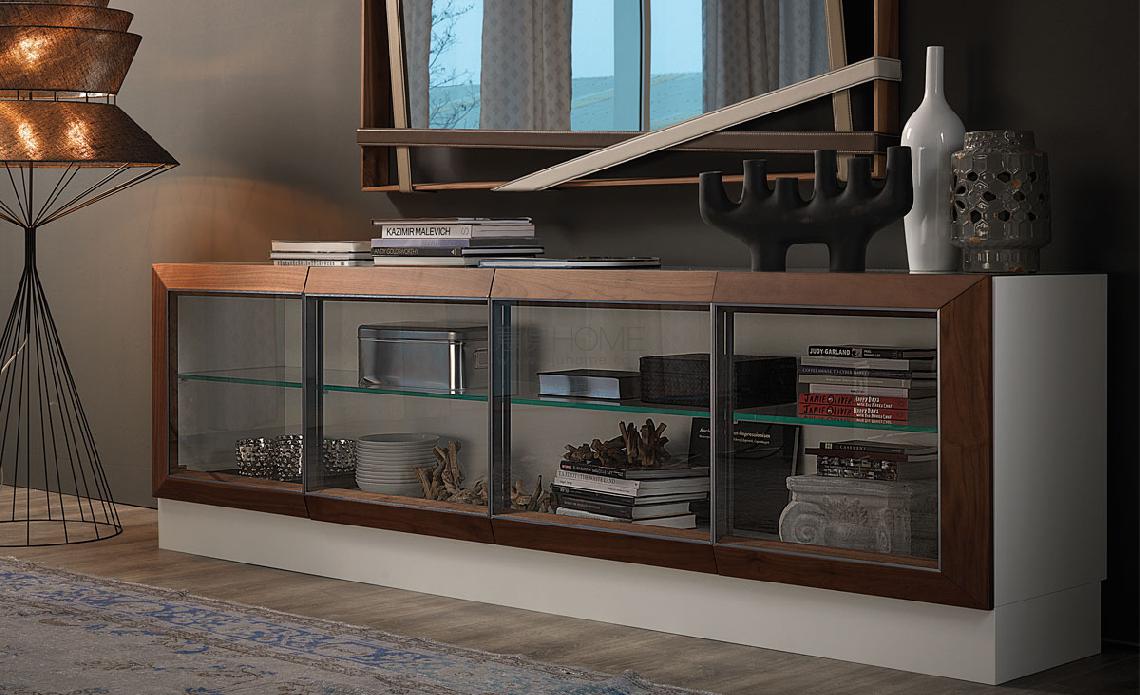 Sideboard, display cabinet in matt white (OP7) or graphite (OP69) lacquered frame. Door profiles lacquered in matt white (OP7) or graphite (OP69) or Canaletto walnut (NC). Doors and internal shelves in extra clear glass. Sideboard h74 and h139 with top in white or graphite painted extra clear glass. Optional: internal led light kit.