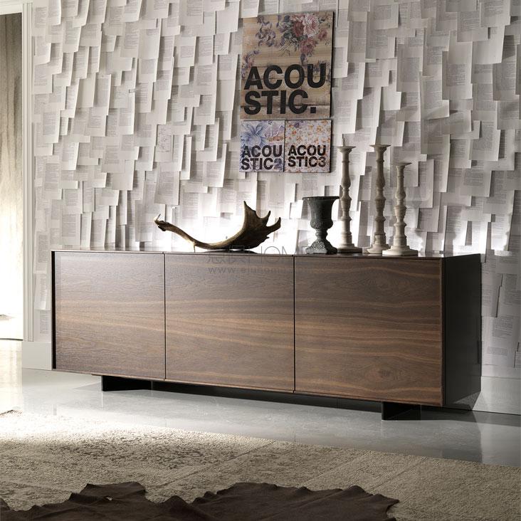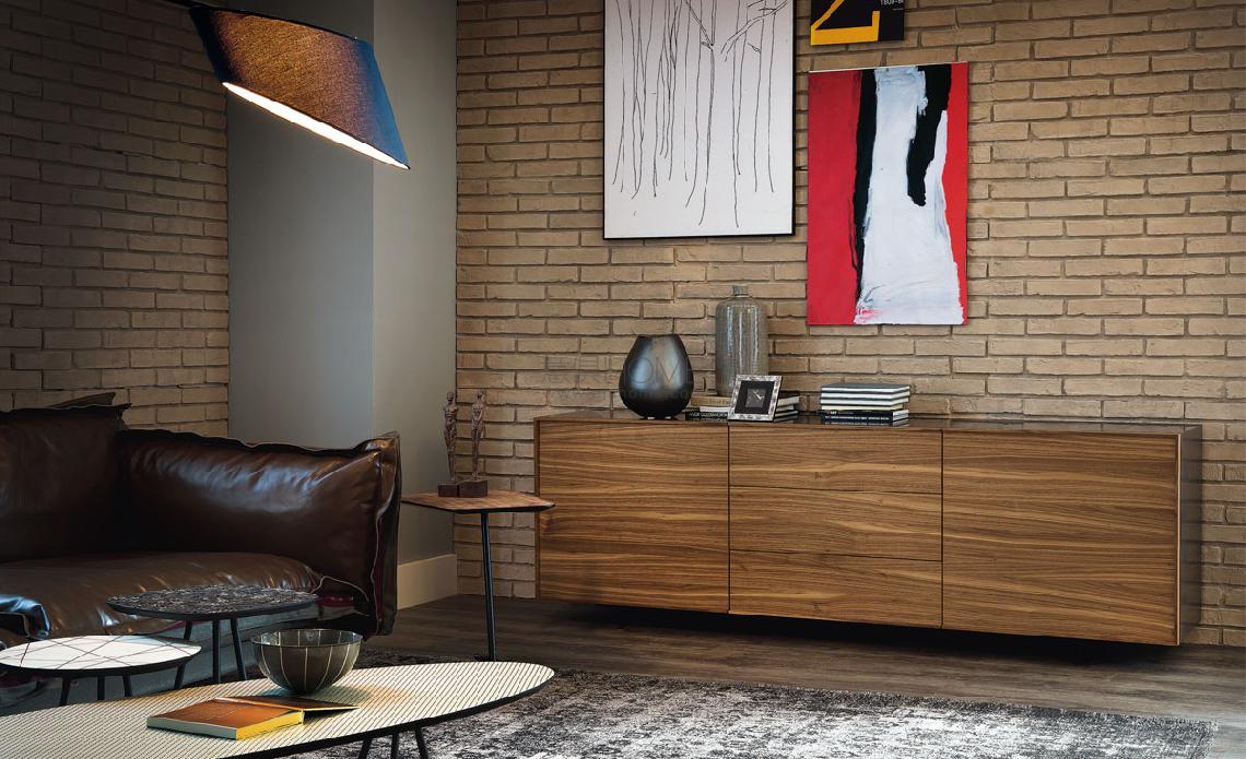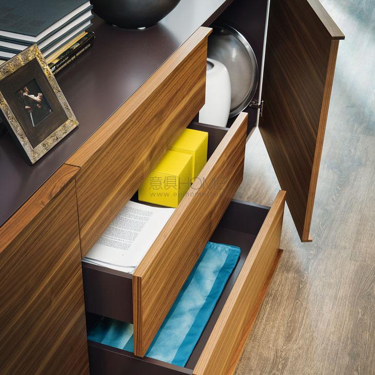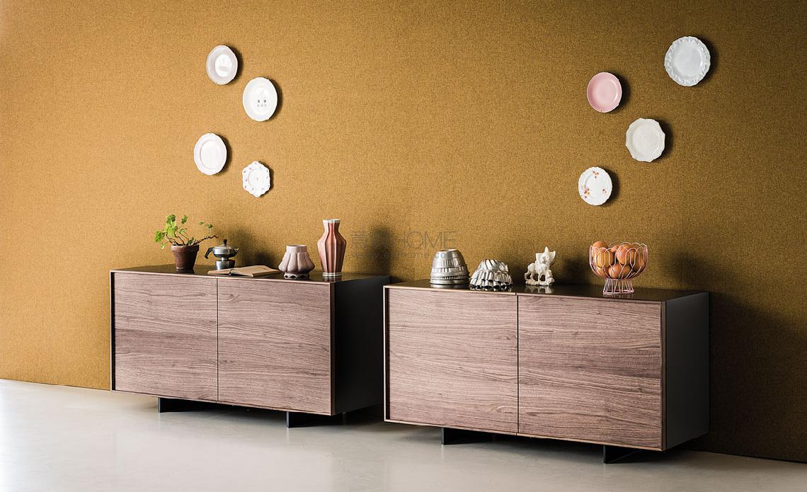 Sideboard with wooden frame in white (OP7) or graphite (OP69) lacquered wood. Doors and drawers in Canaletto walnut (NC) or burned oak (RB). Black embossed painted steel feet (GFM73). Internal clear glass shelves. Optional: internal drawer in each door. In the 4 version, optional internal drawer only in the two lower doors.