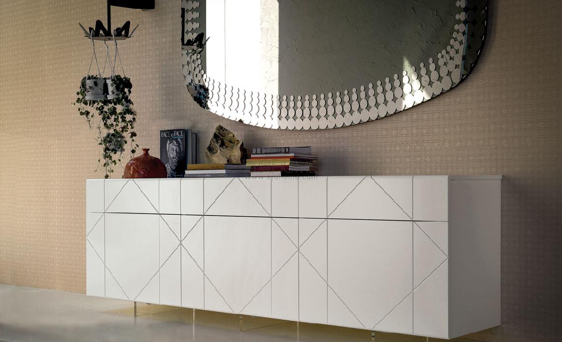 Sideboard with matt white (OP7) or graphite (OP69) lacquered doors and drawers. Feet in transparent methacrylate. Internal shelves in clear glass on demand.