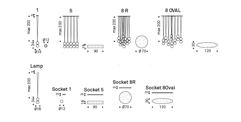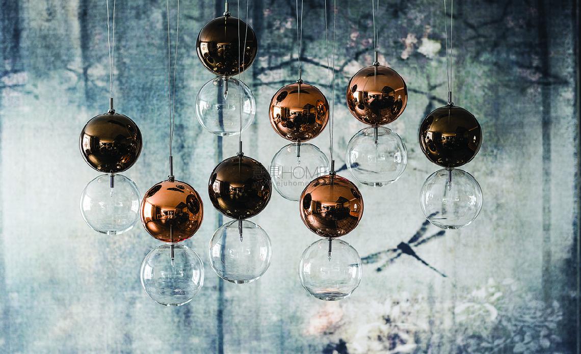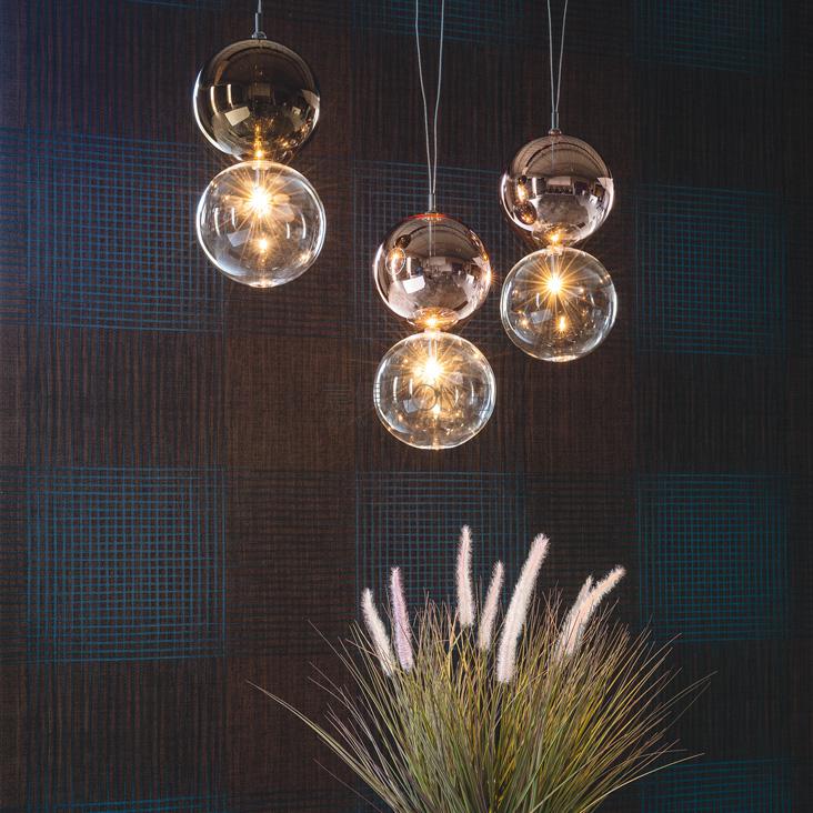 Ceiling lamp with lampshade made of 2 borosilicate glass spheres. Lower sphere in transparent glass and upper sphere in transparent glass or painted chrome, copper, bronze. Ceiling fixing in chromed steel. S1: single plate. S5: rectangular ceiling plate for 5 lampshades. S8R: round ceiling plate for 8 lampshades. S8oval: oval ceiling plate for 8 lampshades. Bulb included.