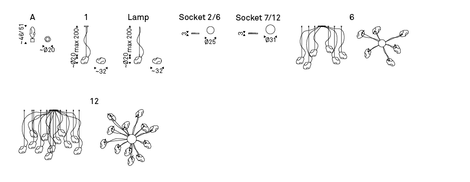 Ceiling or table lamp. Table lamp with lampshade in Iride glass and satin Nickel base. Ceiling lamp with lampshade in Iride glass or smoked grey glass. S1: single plate. S2/6: round ceiling plate for 2/6 lampshades. S7/12: round ceiling plate for 7/12 lampshades. Bulb included.