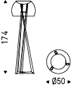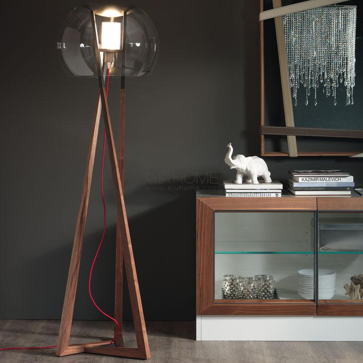 Floor lamp with frame in Canaletto walnut (NC) or burned oak (RB) and matt graphite (OP69) steel. Lampshade in clear glass. Red cable. Bubbles and irregularities of the lampshade are peculiarities of blown glass. Bulb not included.