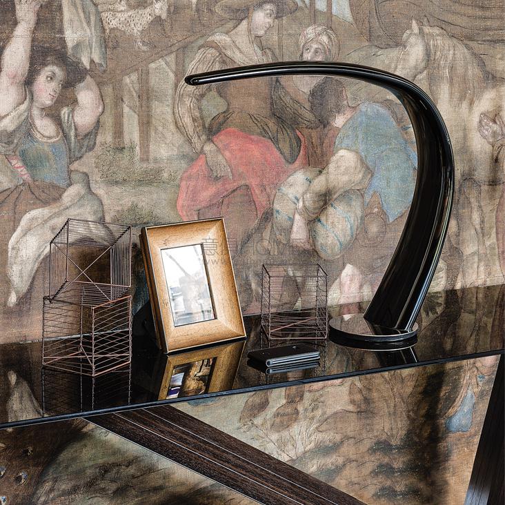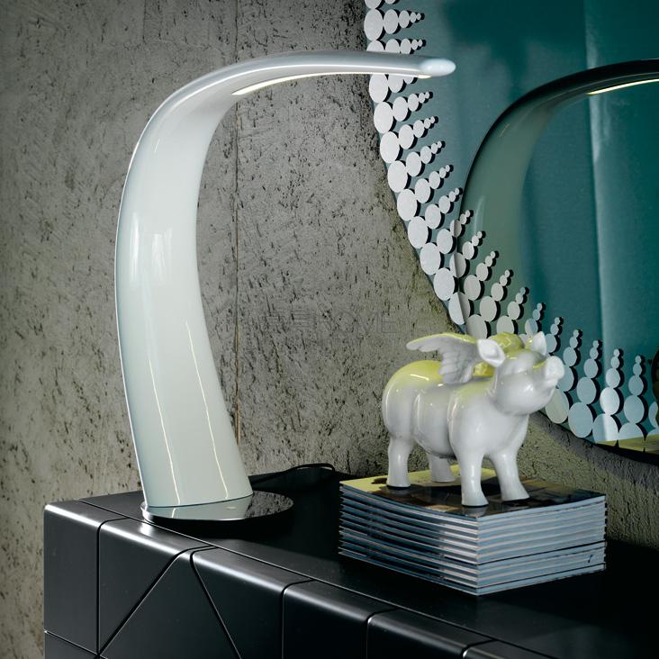 Table lamp in titanium (M11), polished white (L7), polished black (L3) painted rigid polyurethane with base in polished stainless steel or in brushed bronze painted with base in black chrome (06). Led light.