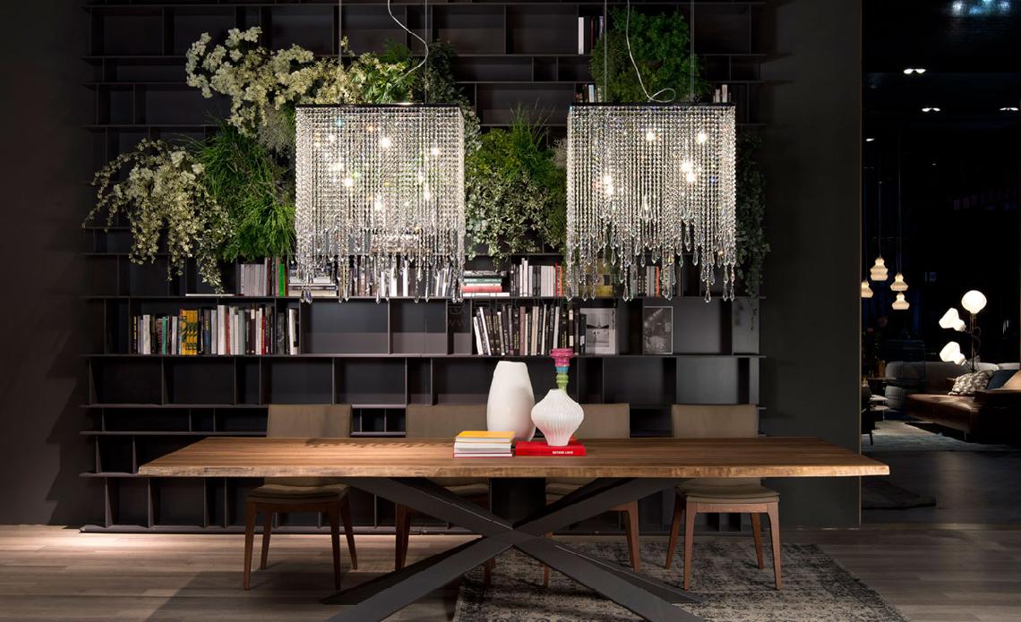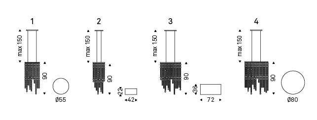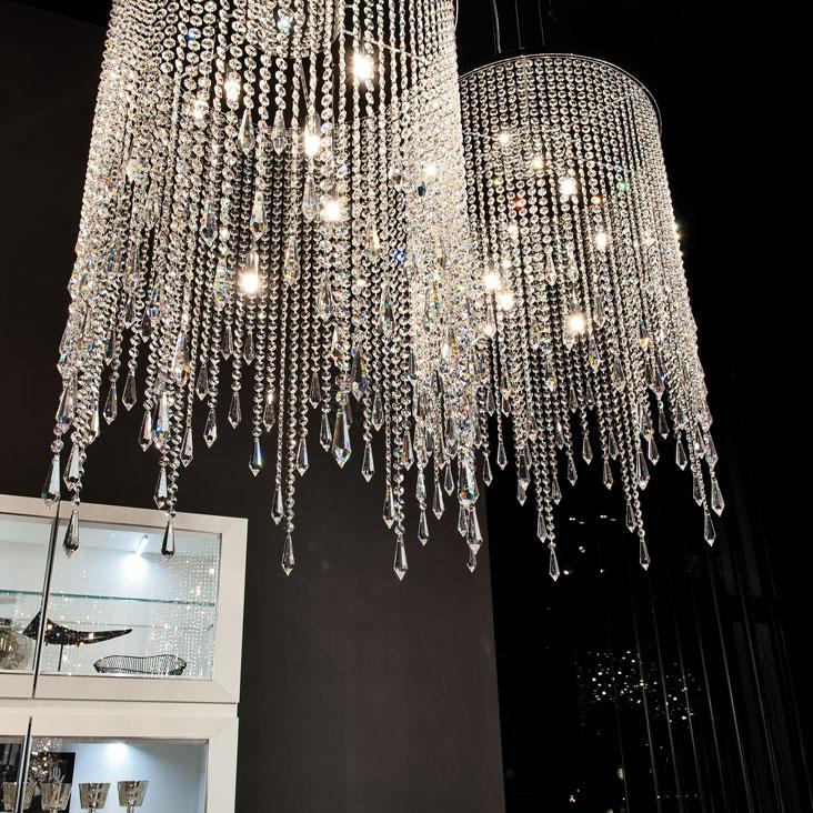 Ceiling, wall and floor lamp with chromed steel frame (08); lampshade made of glass pendants. Bulbs included.