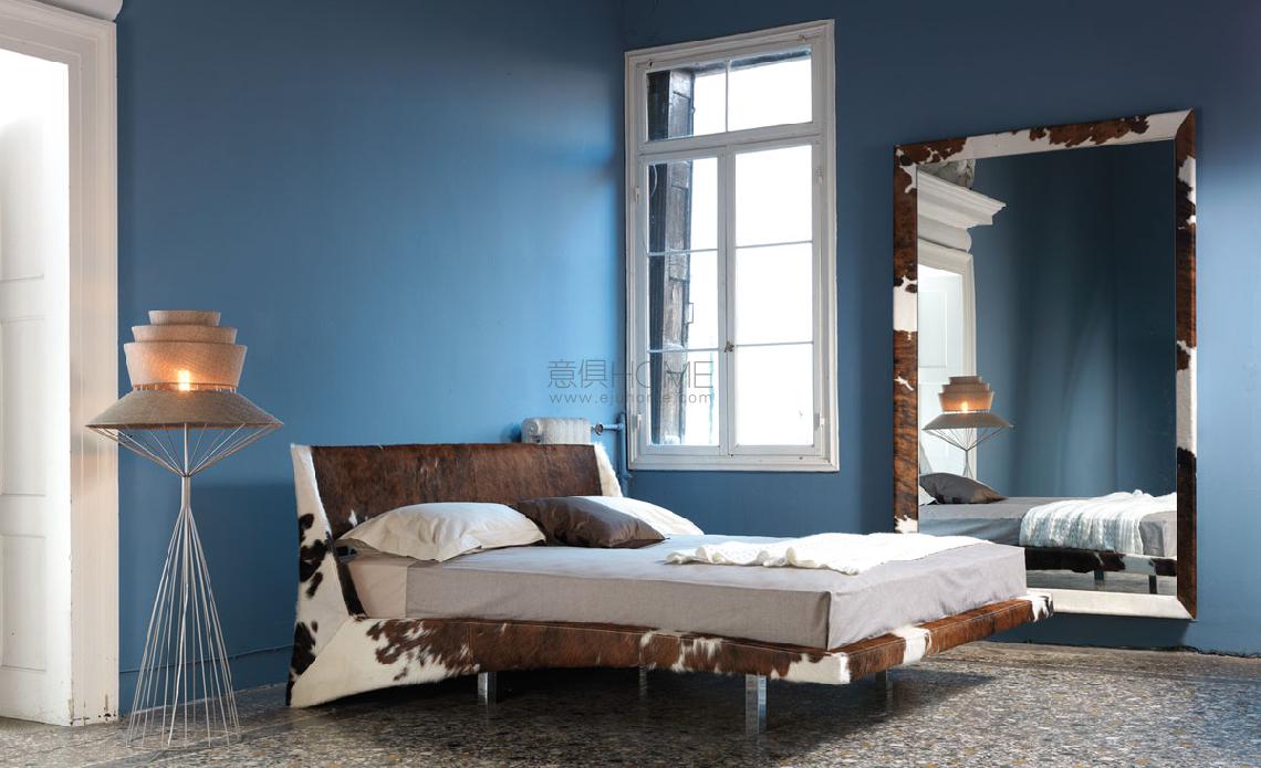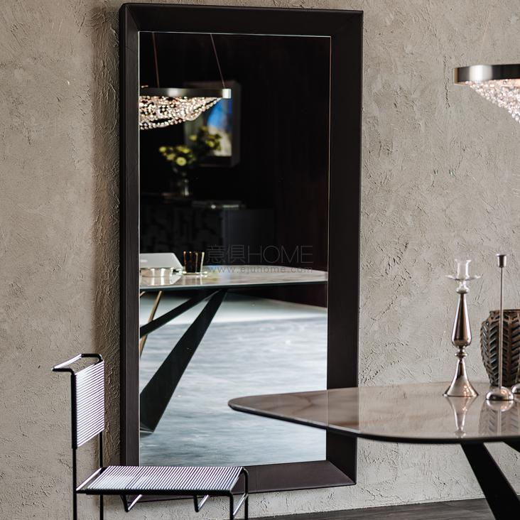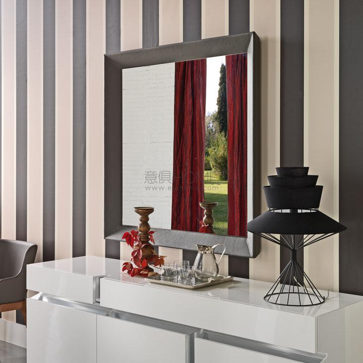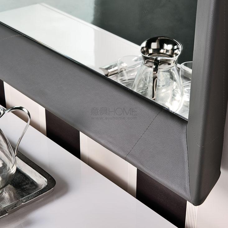 Wall or floor mirror in mirrored or fumé mirrored glass with frame covered in synthetic leather or soft leather as per sample card.