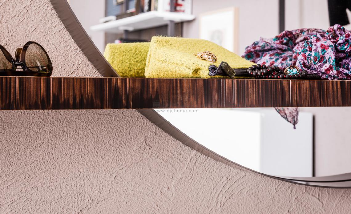 Wall mirror. Frame in transparent varnished steel (OP0), titanium (GFM11), graphite (GFM69) or black (GFM73) embossed lacquered steel or Brushed Bronze lacquered steel. Shelf in Canaletto walnut (NC) or Heritage oak (HR).
