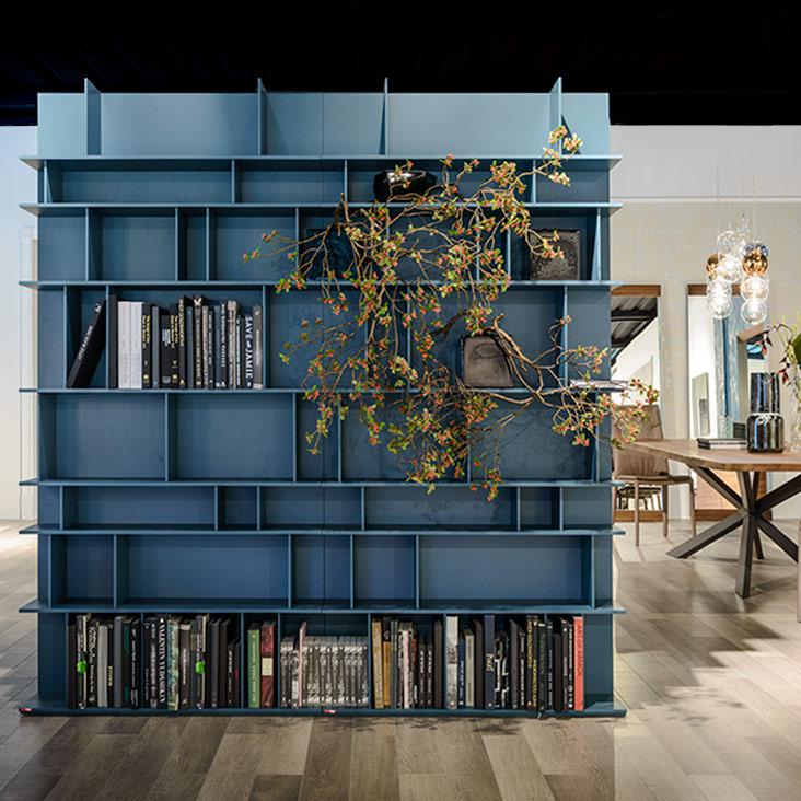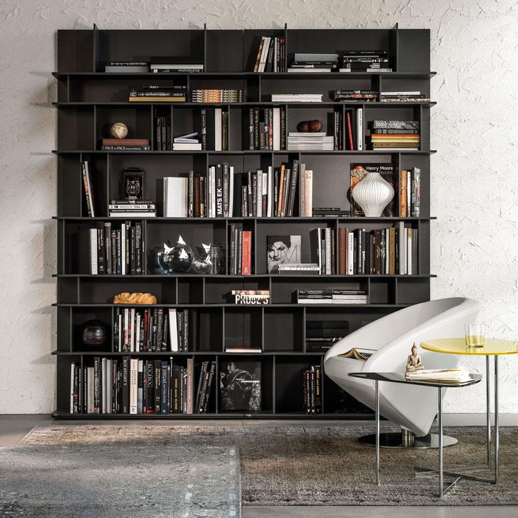 Modular bookcase in titanium (GF11), bronze (GF15), white (GF71), black (GF73), graphite (GF69), oyster (GF50) or ottanio (GF80) lacquered embossed MDF. Max capacity: kg 60 (105), kg 45 (65), kg 40 (B), kg 20 (P) spread load. Wall anchorage is necessary.