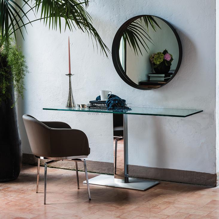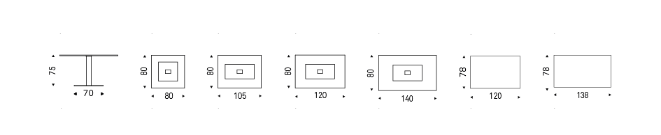 Table with base in graphite (GFM69), white (GFM71) embossed lacquered steel or with satin stainless steel anti-marks base and polished stainless steel column. Top in 15mm clear glass, grey London Fenix (LM21) or castoro Ottawa Fenix (LM22) laminated wood.