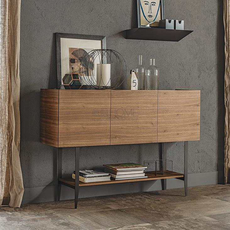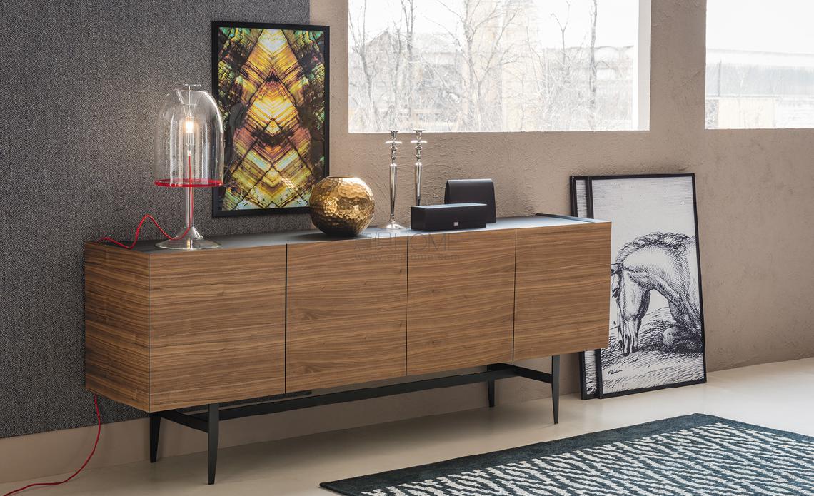 Sideboard with 3 or 4 doors in Canaletto walnut (NC) or burned oak (RB). Top in moka painted frosted extra clear glass. Internal shelves in graphite painted wood. Graphite embossed lacquered steel base (GFM69). A3 and A4 versions with lower shelf in Canaletto walnut (NC) or burned oak (RB), wall anchorage is required.