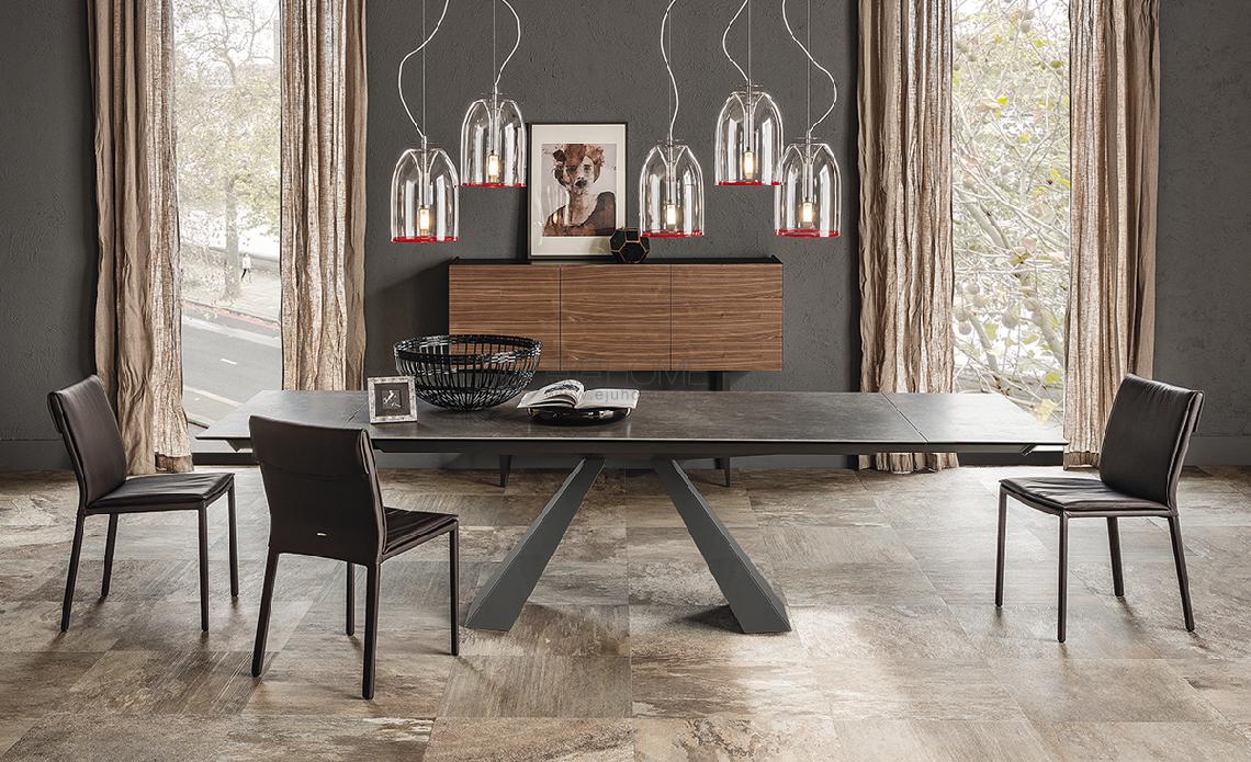 Extendible table with base in titanium (GFM11), bronze (GFM18), graphite (GFM69), white (GFM71) or black (GFM73) embossed lacquered steel. Marmi ceramic top and extensions in Calacatta (KM01), Alabastro (KM02), Ardesia (KM04), matt Golden Calacatta (KM05), glossy Golden Calacatta (KM06), matt Portoro (KM07), glossy Portoro (KM08), glossy Sahara Noir (KM09), Emperador (KM10), Makalu (KM11), Breccia (KM12) or Arenal (KM13).