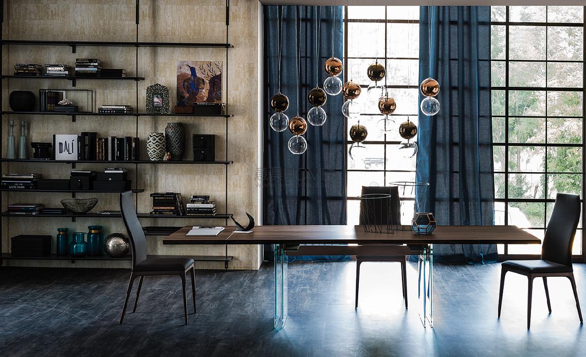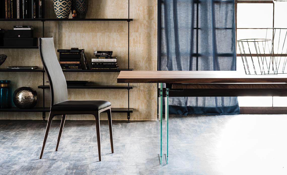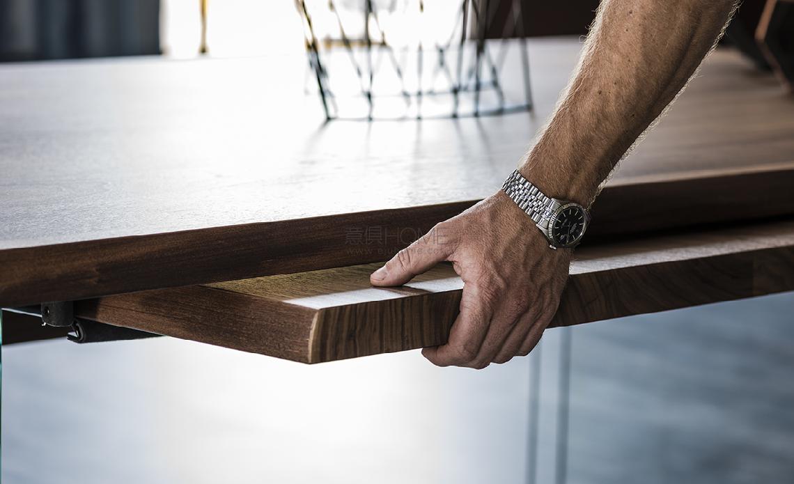 Extendible table with 15mm extra clear tempered glass base and graphite (OP69) beam. Top and extensions in Canaletto walnut (NC), burned oak (RB) or natural oak (RN) with irregular solid wood edges. Available also with Canaletto walnut (NC), burned oak (RB) or natural oak (RN) beam.