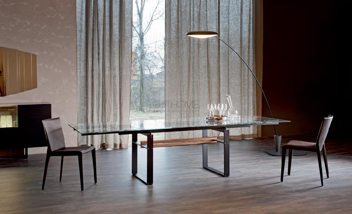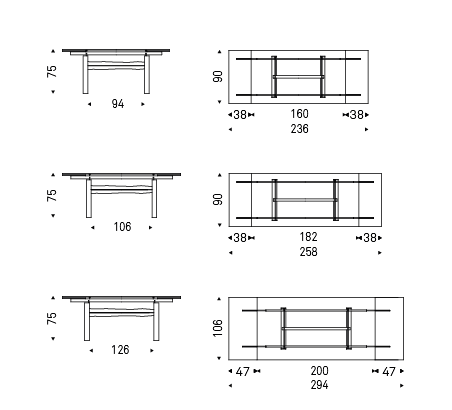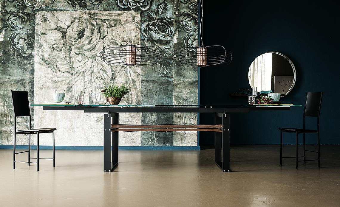 Extendible table with steel base and aluminuim rails in graphite (GFM69), white (GFM71) or black (GFM73) embossed lacquered. Central beam in natural solid Canaletto walnut (NC) or embossed graphite (GFM69), white (GFM71), black (GFM73) lacquered steel. Top and extensions in 12mm clear or extra clear glass. The top is laid on the base.