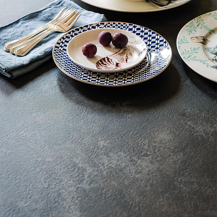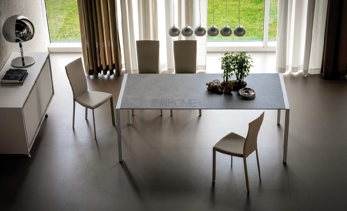 Extendible table with base in graphite (GFM69) or white (GFM71) embossed lacquered steel, with or without profiles in polished stainless steel. Top and extensions in matt white (LM01) post-formed or grey oxide (LM06) laminated wood.