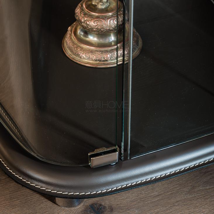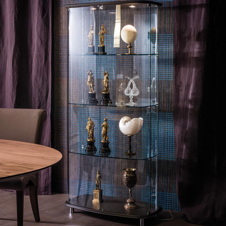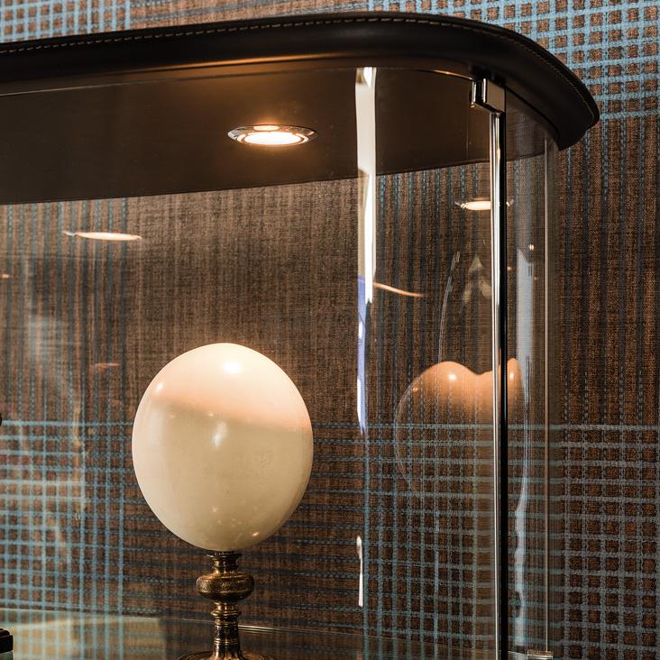 Clear glass showcase with top and bottom covered in leather as per sample card. With 2 led lights. Max capacity: each shelf kg 10.