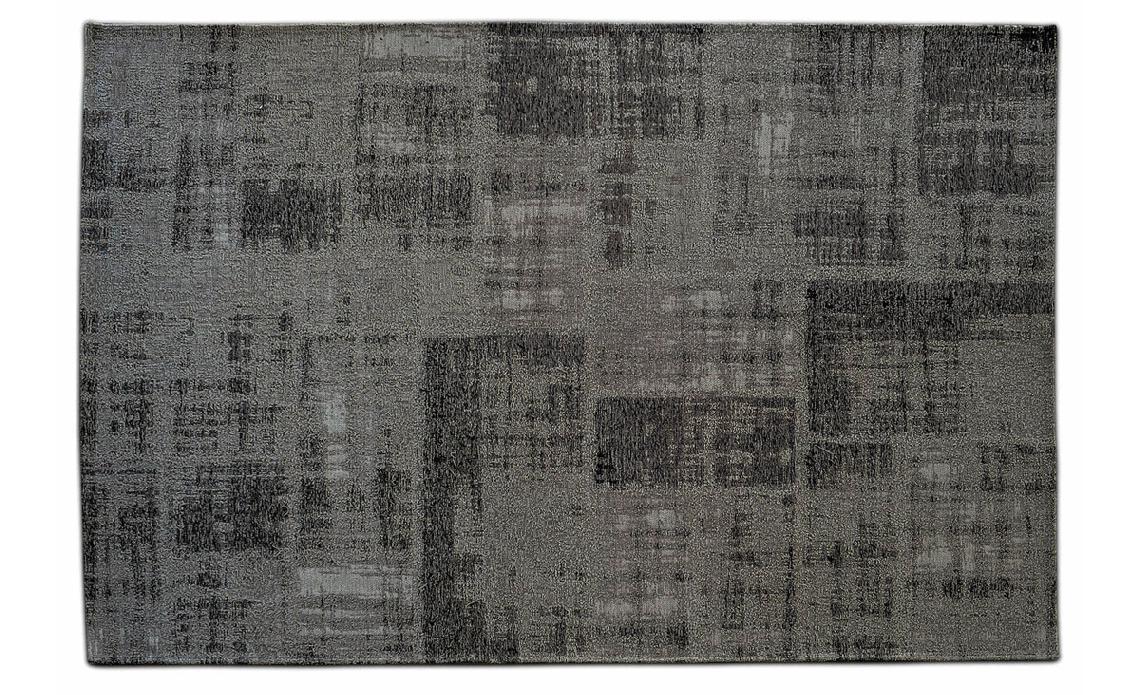 Rug made in cotton and chenille with relief and with a faded and used appearance.