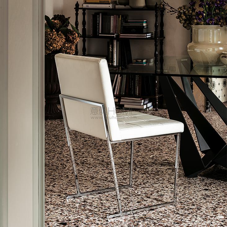 Chair with or without arms with matt graphite (OP69), white (OP71), chromed (08) or black chrome (06) steel frame. Seat and back capitonè upholstered in synthetic leather or soft leather as per sample card. The cover is not removable.