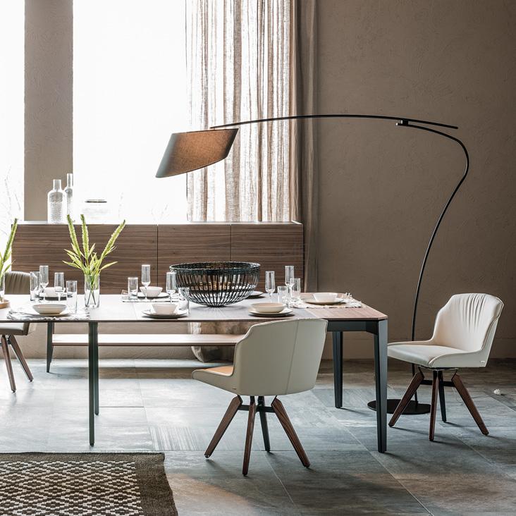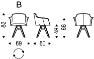 Swiveling chair with or without arms, with white (GFM71) or graphite (GFM69) embossed lacquered steel frame. Feet in natural ashwood (frN), Canaletto walnut stained ashwood (frNC), burned oak stained ashwood (frRB) or open pore matt white (fr71) or black (fr73) painted. Seat and back upholstered in fabric, synthetic nubuck, micro nubuck, synthetic leather or soft leather as per sample card.