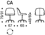 Swiveling chair with or without arms, adjustable in height and with castors. Base with 5 spokes in polished aluminium, column and gas piston in chromed steel (08) or with base and column in matt black aluminium and gas piston in chromed steel (08). Seat and back upholstered in fabric, synthetic nubuck, micro nubuck, synthetic leather or soft leather as per sample card.
