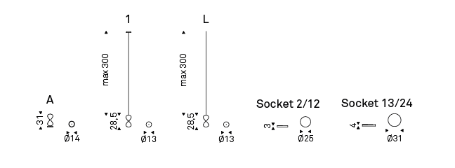 Ceiling or table lamp with lampshades in clear glass or mixed glass (iride-fumé) and ceiling plate in black chrome steel (06). S2/12: round ceiling plate for 2/12 lampshades. S13/24: round ceiling plate for 13/24 lampshades. Bulb included.