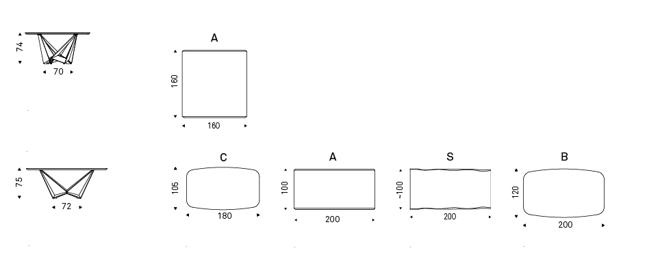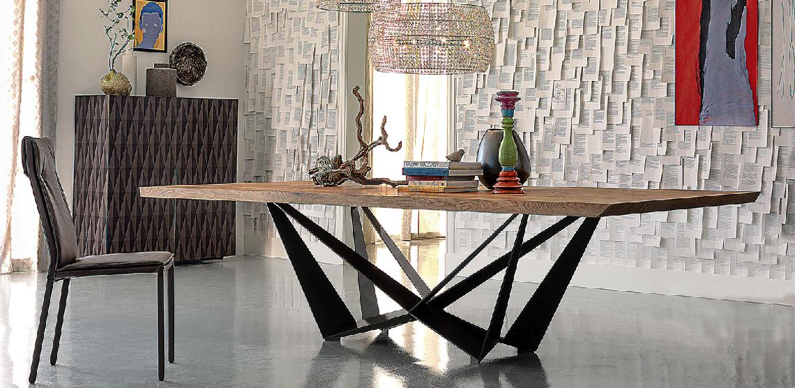 Table with base in titanium (GFM11), bronze (GFM18), graphite (GFM69), white (GFM71) or black (GFM73) embossed lacquered steel, Brushed Bronze or Brushed Grey lacquered steel. A version: top with angled edges in Canaletto walnut (NC), Heritage oak (HR) or natural oak (RN). 4cm thick wooden top on160x160 and 200x100 versions and 5cm on 240x120 and 300x120 versions. Special sizes for top on demand. Version "S": top with irregular solid wood edges in Canaletto walnut (NC), burned oak (RB) or natural oak (RN), 4cm thickness. Vesion "B": barrel top with angled edges in Canaletto walnut (NC) or burned oak (RB). Version "C": top in Canaletto walnut (NC) with Brushed Grey lacquered and rounded lower profile or Elm open pore matt black (OLM73) with Brushed Bronze lacquered and rounded lower profile.
