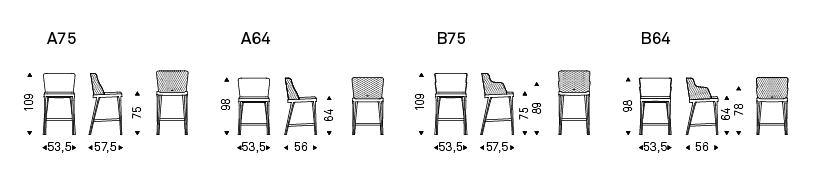 Stool with or without arms with frame in natural ashwood (frN), Canaletto walnut stained ashwood (frNC), burned oak stained ashwood (frRB), open pore matt white (fr71) or black (fr73) painted ashwood. Seat and back upholstered in synthetic nubuck, synthetic leather or soft leather as per sample card. Quilted seatback cover. The cover is not removable.