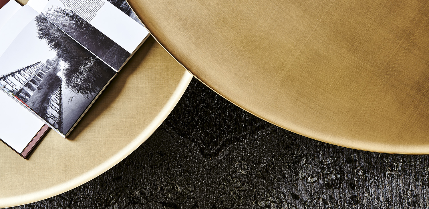 Coffee table with base in titanium embossed lacquered steel (GFM11) and top in Brushed Brass lacquered steel.