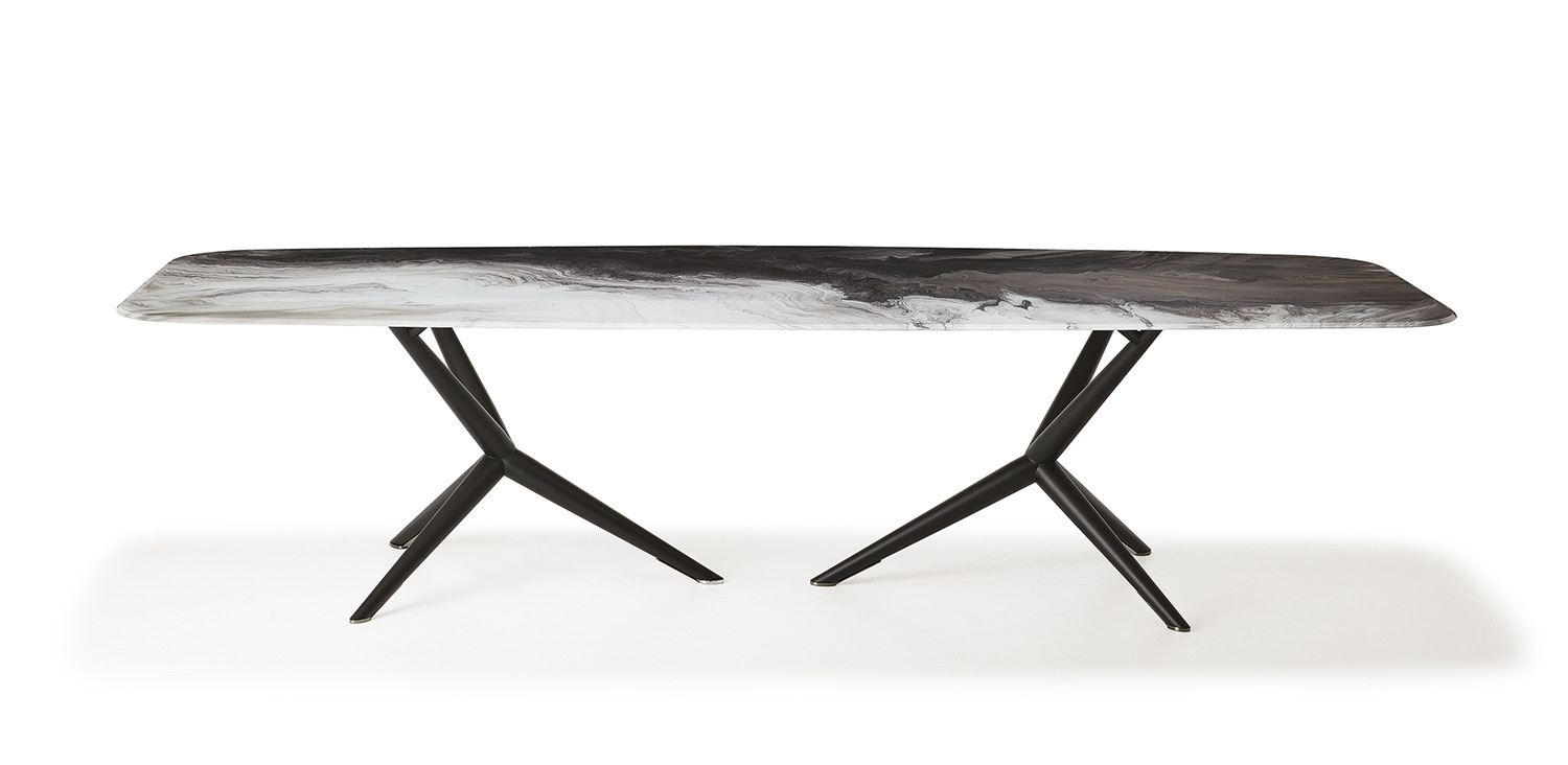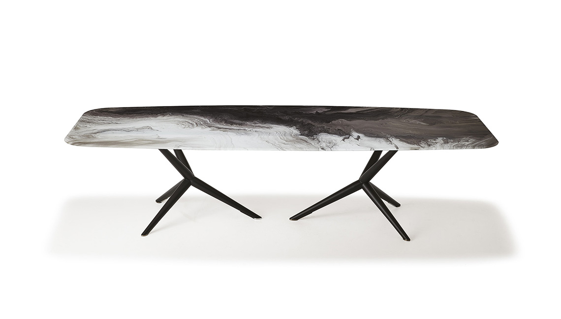 Table with titanium (GFM11), bronze (GFM18), graphite (GFM69) or black (GFM73) embossed lacquered steel base. Feet in black chrome (06). Top 12mm thick in extra clear bevelled glass with artistic decorative printing in two different colours (CY01, CY02).